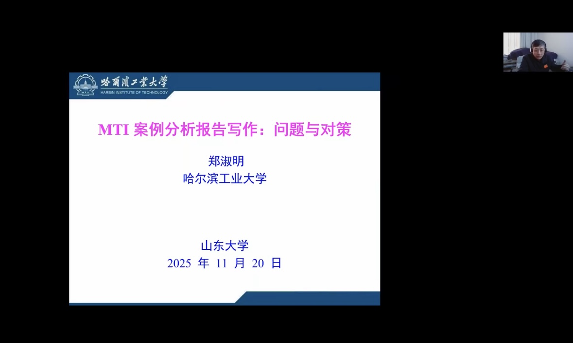 11月20日,金沙集团3354cc“洪楼译坛”2025年第8期学术讲座通过腾讯会议顺利举行。哈尔滨工业大学人文社科学部副教授、翻译教学与研究中心主任郑淑明应邀担任主讲,讲座主题为“MTI案例分析报告写作:问题与对策”。本次讲座由金沙集团3354cc赵爱萍副教授主持,吸引了校内外翻译专业师生及相关领域学者近300人在线参与。