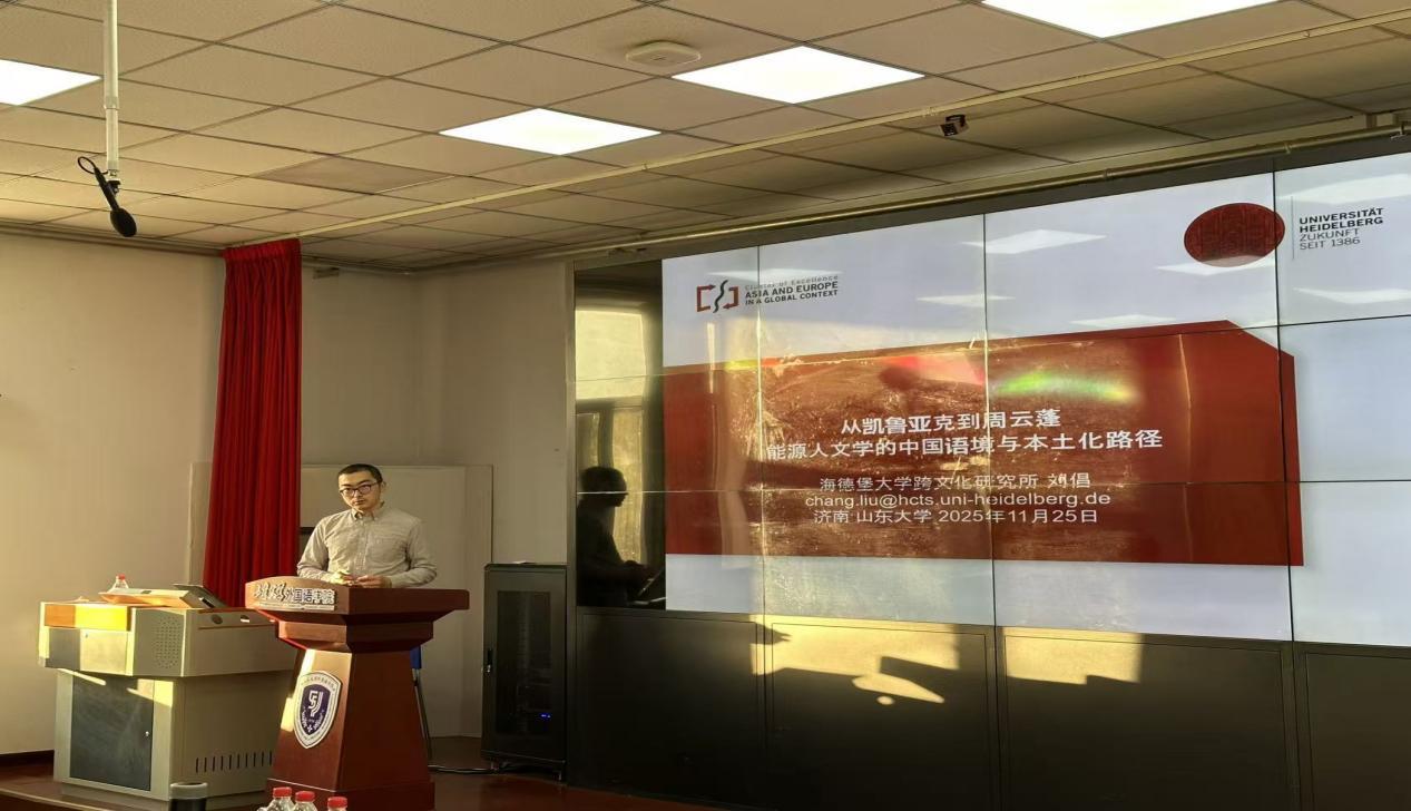 11月25日下午,金沙集团3354cc“博约论坛”2025年第2期学术讲座在洪家楼校区举行。本期论坛特邀德国海德堡大学跨文化研究所研究员刘倡博士担任主讲,以“从凯鲁亚克到周云蓬:能源人文学的中国语境与本土化路径”为题,为外院师生带来一场跨越文学、音乐、生态与能源领域的跨学科思想盛宴。讲座由金沙集团3354cc郑春光副研究员主持,