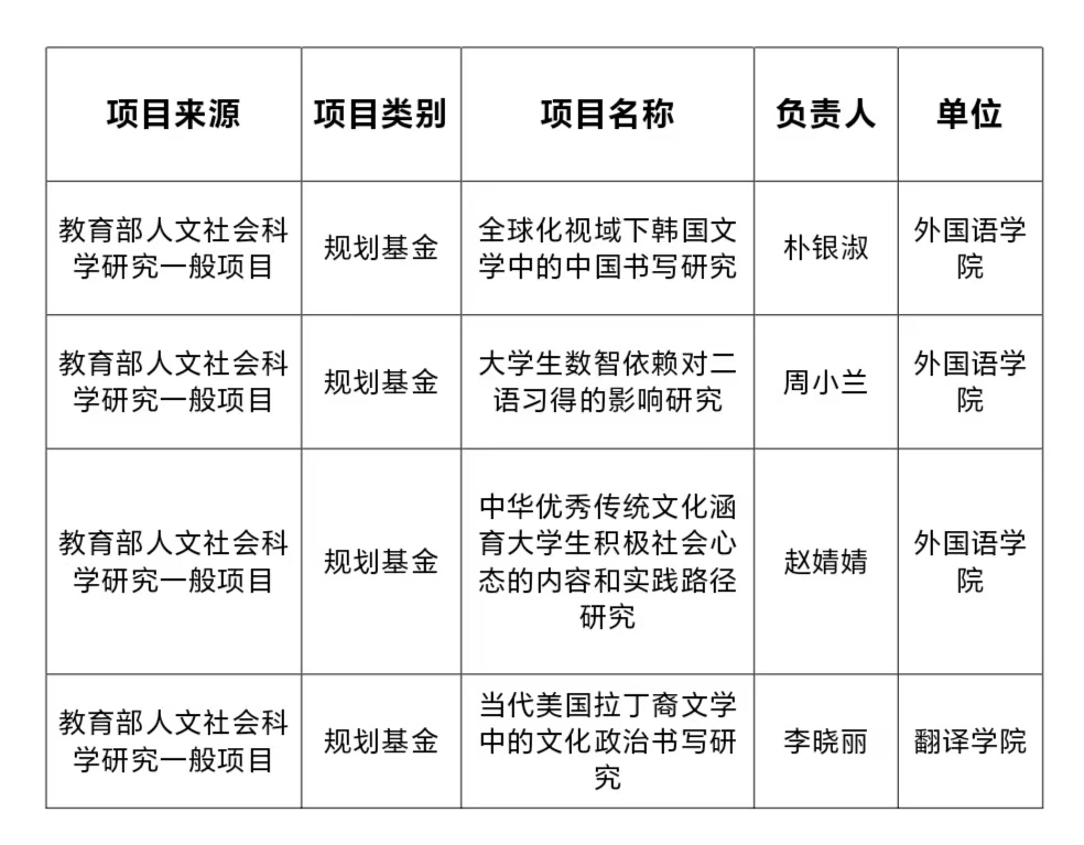 教育部人文社会科学研究一般项目涵盖规划基金、青年基金、自筹经费等类别,旨在鼓励高校教师开展基础性、前瞻性研究,推动人文社科领域的理论创新与应用转化。本学科获批项目紧密结合国家发展战略与学术前沿动态,展现了“小切口、大问题”的选题特色与“理论突破+现实需求”的研究导向。未来,外语学科将进一步支持人文社科领域的原创性研究,推动学科交叉融合,以创新性成果赋能高质量人才培养。
