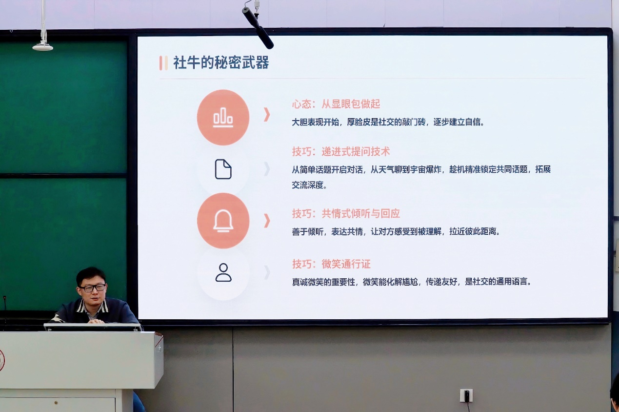 随后,讲座进入核心部分——“破解‘社恐’”环节。高程带来了实用的“社交急救包”,包括“5秒法则”、“心理暗示法”、“焦点效应”等心理技巧,以及“细节+真诚”的低成本社交公式,帮助同学们在实际社交中快速上手。
