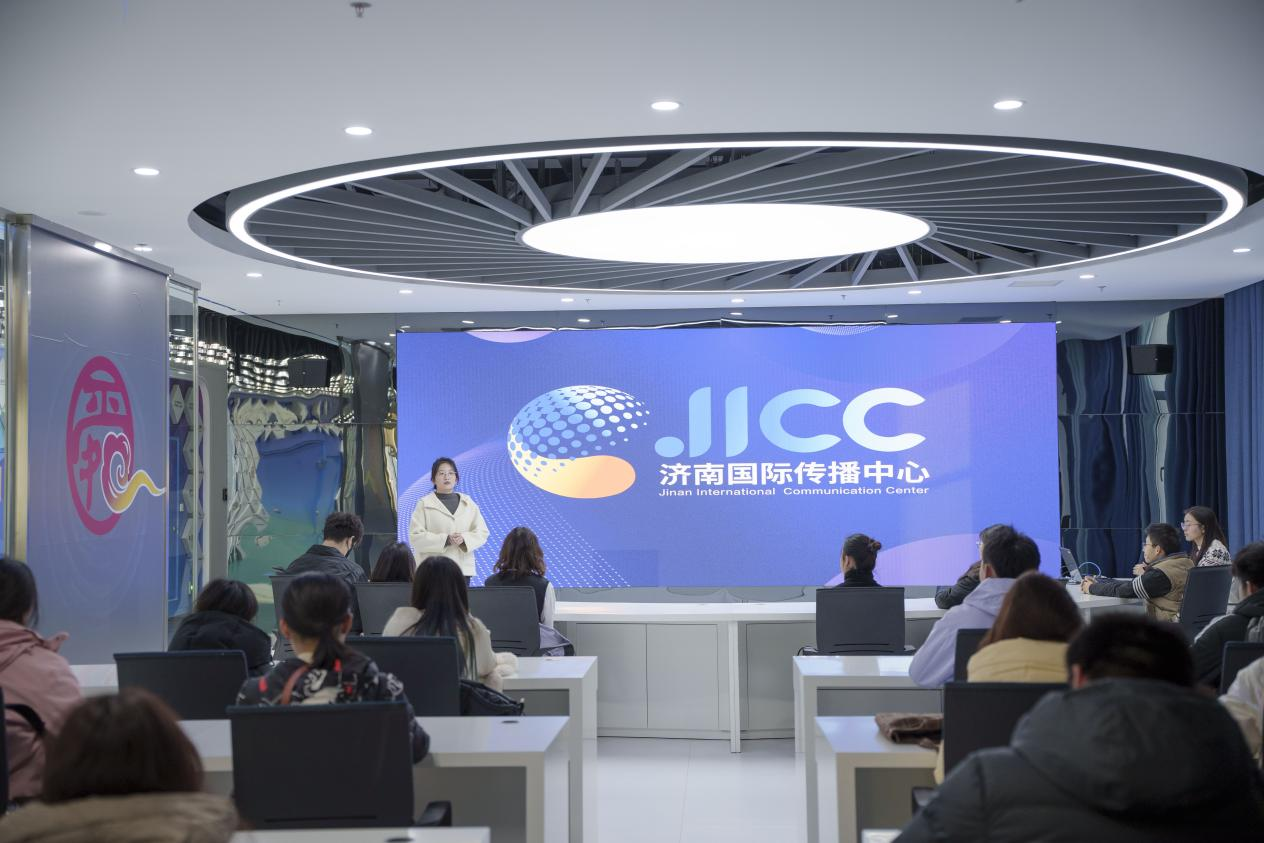 师生们实地探访了传播中心的实景拍摄棚、室内演播厅、后期制作室等多个核心功能区域,全面了解了国际传播内容从策划、拍摄到剪辑、输出的全流程运作模式。在成果展示环节,大家共同观看了传播中心精心打造的《Z世代黄河文化之旅》系列短视频,直观感受传播中心如何以年轻化、国际化的表达,将黄河文化的深厚底蕴转化为海外受众喜闻乐见的传播内容,深刻体悟其在推动济南城市形象国际传播中的创新实践与显著成效。