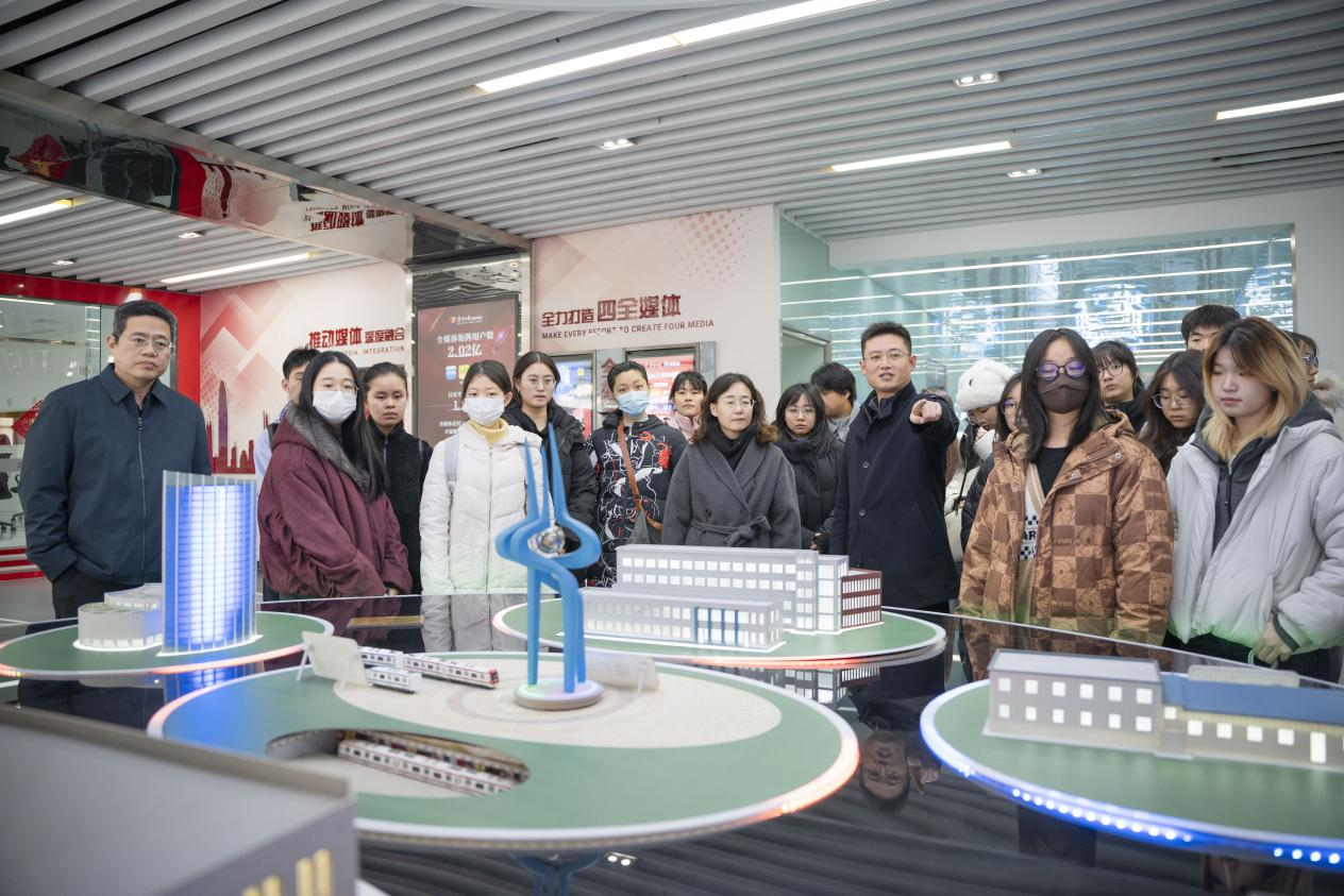 在参观环节,济南国际传播中心负责人刘钦涛介绍,济南国际传播中心是由济南日报报业集团打造的对外传播枢纽,目前已构建起覆盖海外社交平台与全球合作媒体的多元化传播矩阵。刘钦涛还指出,传播中心已与金沙集团3354cc共建研究生培养基地,未来将持续深化校企合作,与学院共同培养具备高度专业素养与广阔国际视野的新时代国际传播人才。