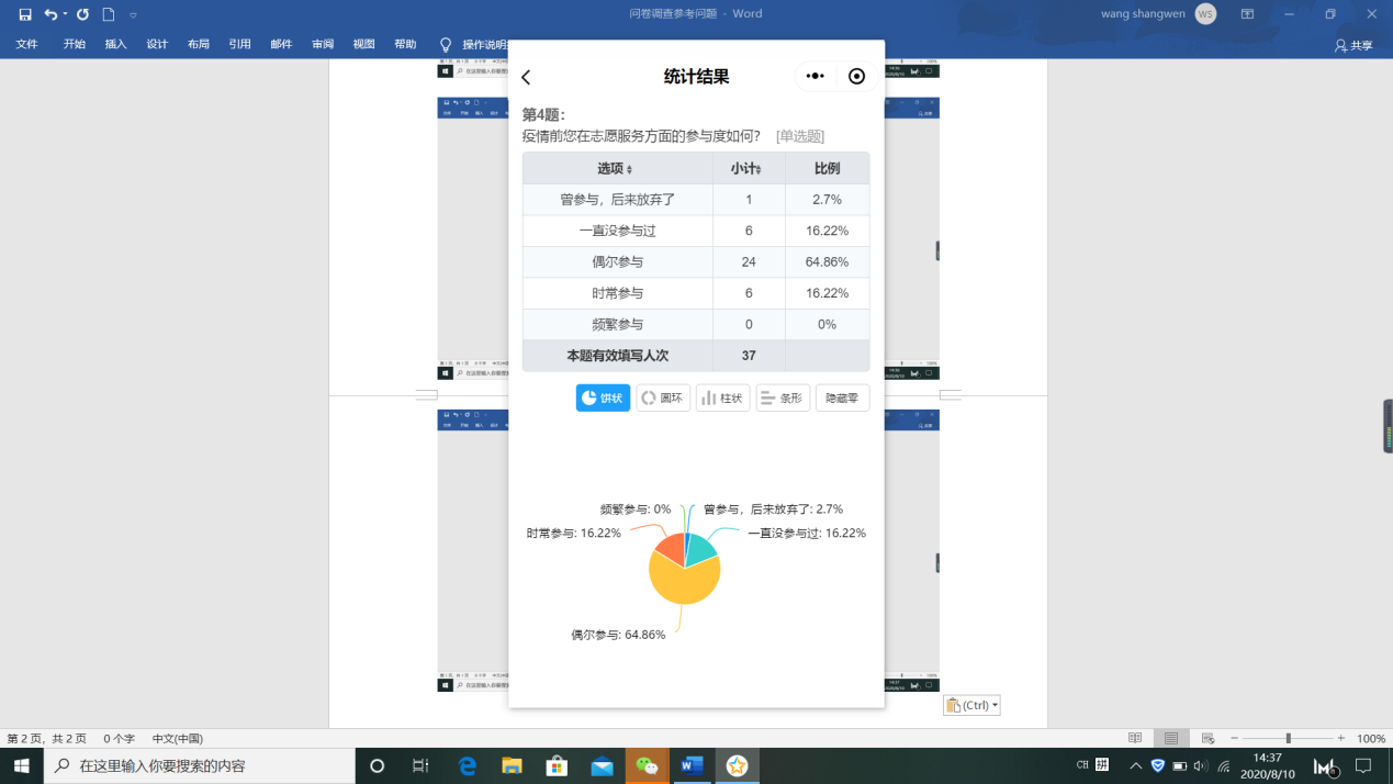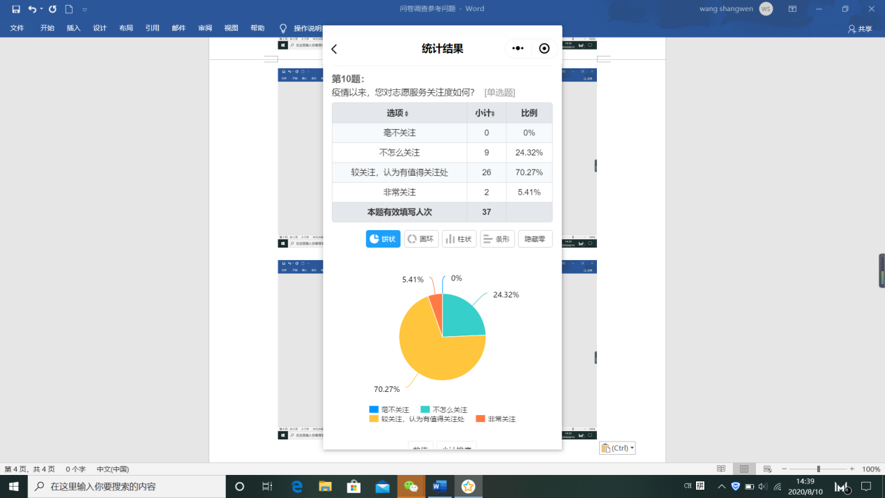 截至8月10日下午三点,在剔除无效答卷后,本次调查共获得37份有效样本,参与本次调查的男性共4人,女性共33人,其中18岁以下4人,18-35岁33人,由此可见,参与本次调查的都为青少年群体,本次调研从一定程度上,获悉了这一群体对于疫情常态化背景下志愿服务活动状况的看法。
