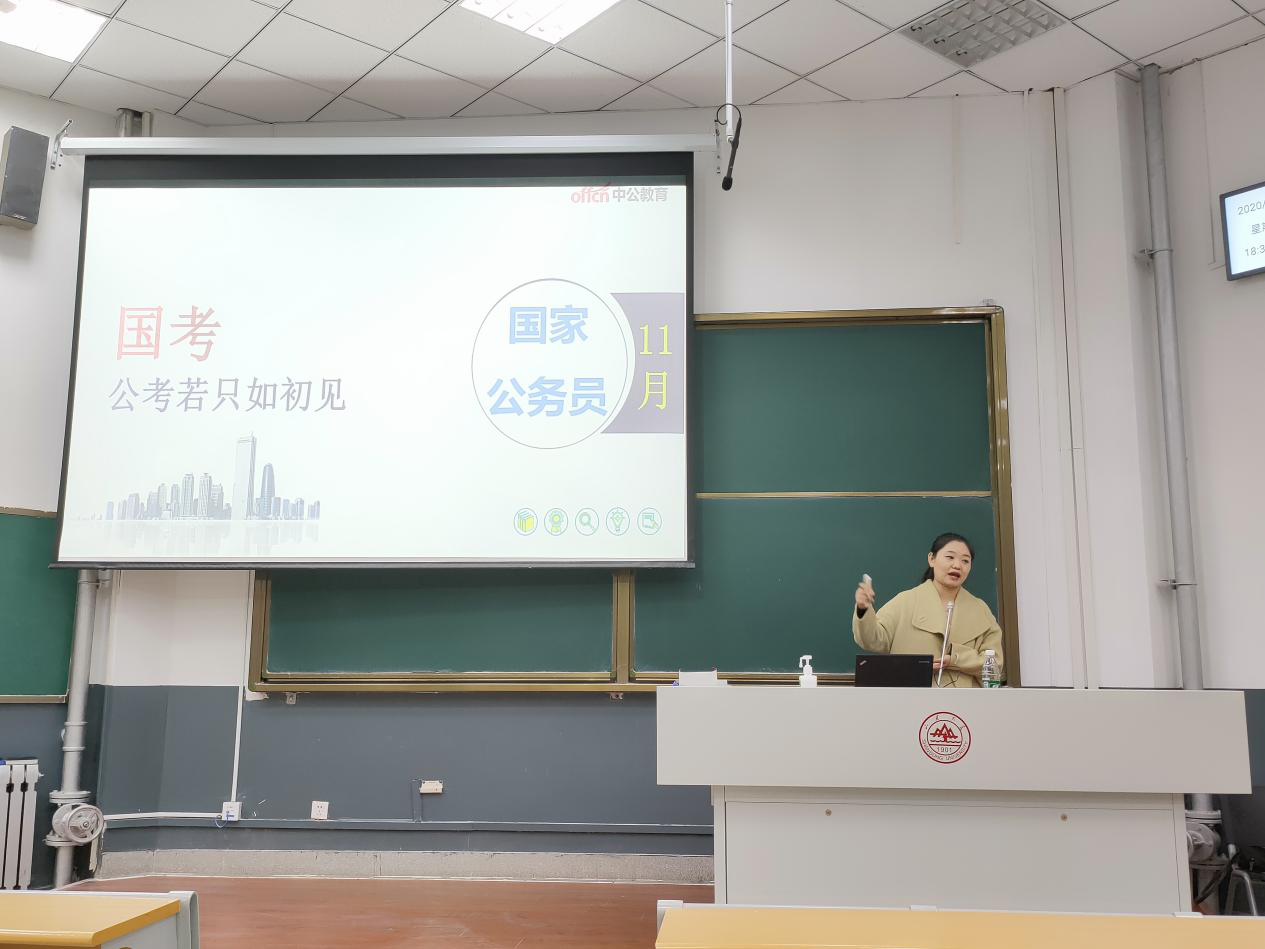 11月6日晚,金沙集团3354cc在洪家楼校区举办国考备考讲座。本次讲座由金沙集团3354cc研究生会实践部主办,由中公教育资深品牌宣讲师阚维佳担任主讲人。