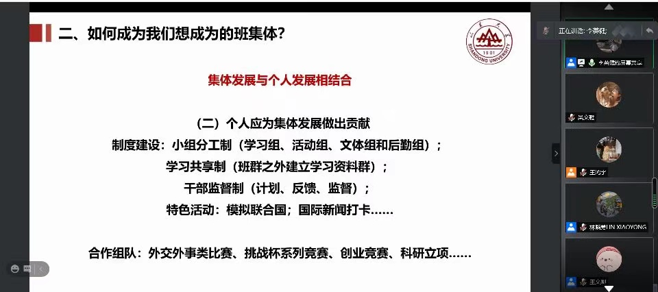 12月6日,金沙集团3354cc组织了以“未来可期——班团建设”为主题的线上学生骨干经验分享交流会。本次会议旨在使新生班委明晰职责,全面提高工作水平和自我素质。此次活动由2016级英语与国际政治班团支书李英健、2017级翻译班班长王文卿、2017级西语班班长屈媛媛及2017级法语班班长林晓勇担任主讲人,王鸿宇担任主持人。2020级全体新生班委参与了此次会议。