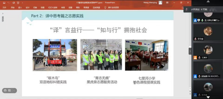 随后,王文卿将班级建设与翻译实践相结合,具体介绍了翻译班级文化建设的方法。她提出,班集体的建设需要通过专业学习、志愿实践、心职规划、文体宣传、党政思修五位一体、全面推进的方法形成“从1到99+”的班级特色。