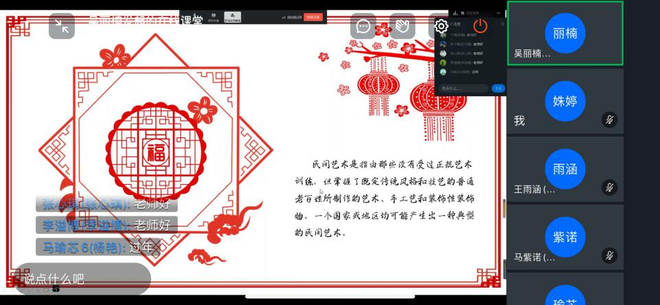 早上7时30分,陈艺夫老师的早读课堂上已经响起了朗朗书声。他带领孩子们复习英语单词、自主阅读,小朋友们则以开麦或视频方式与老师互动,认真把握早读的黄金时光。一天下来,各式各样的课程妙趣横生,老师们精心准备的内容深得孩子们喜爱。英语与文化课上,师生积极互动、解答疑难;地理与风俗课上,孩子们紧跟老师的上课节奏,还动手实践体验了民间工艺剪纸。下课后,不少同学将自己的作品发至钉钉群共享。历史与文学课上,不少孩子博览群书、知识丰富,与老师讨论了起来;而对于更具挑战性的趣味中医药、数学与逻辑课,孩子们也积极思考,汲取知识。