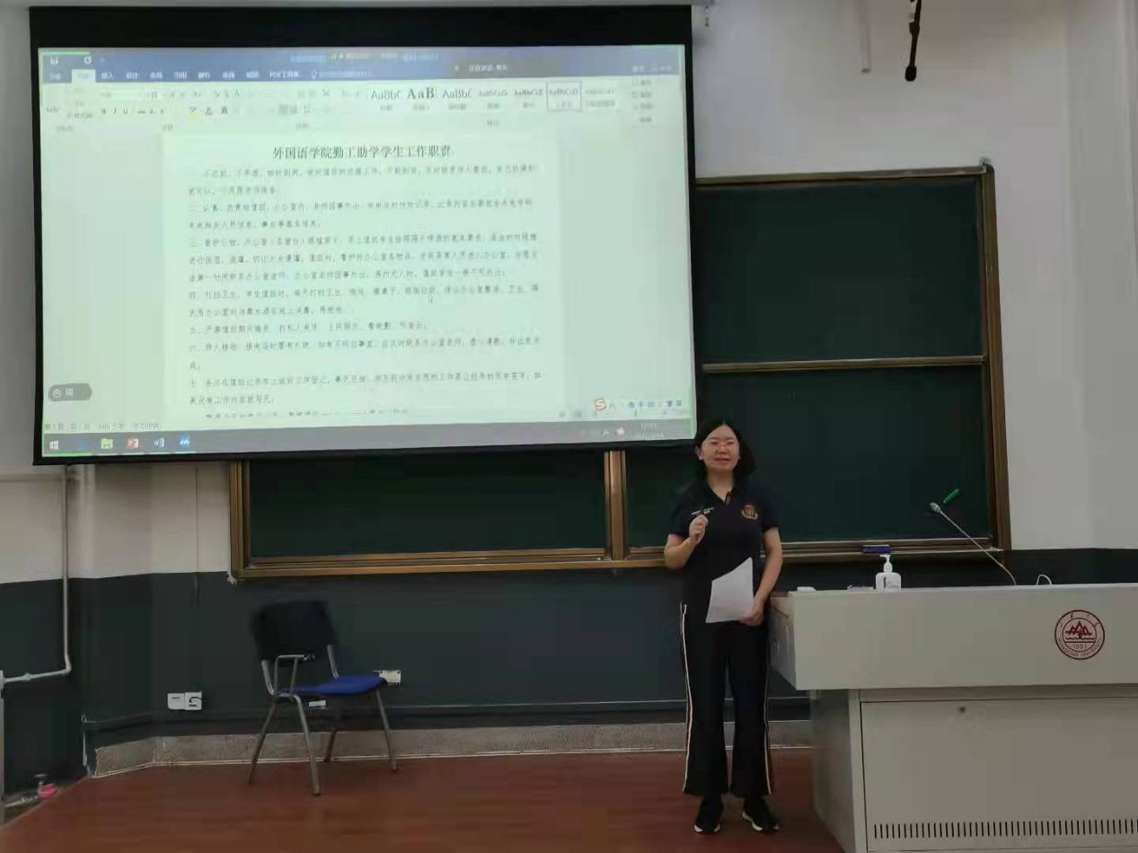 之后,张明明老师向同学们提出几点工作要求:第一,同学们要注意待人接物有礼貌,彰显外院学子的优良礼仪;第二,不可借工作便利谋取私利,要注意工作保密;第三,及时与老师沟通工作进度,有不懂的地方咨询老师;最后鼓励同学们通过参与勤工助学工作增强自身责任感,提升自我综合素质和工作才干。