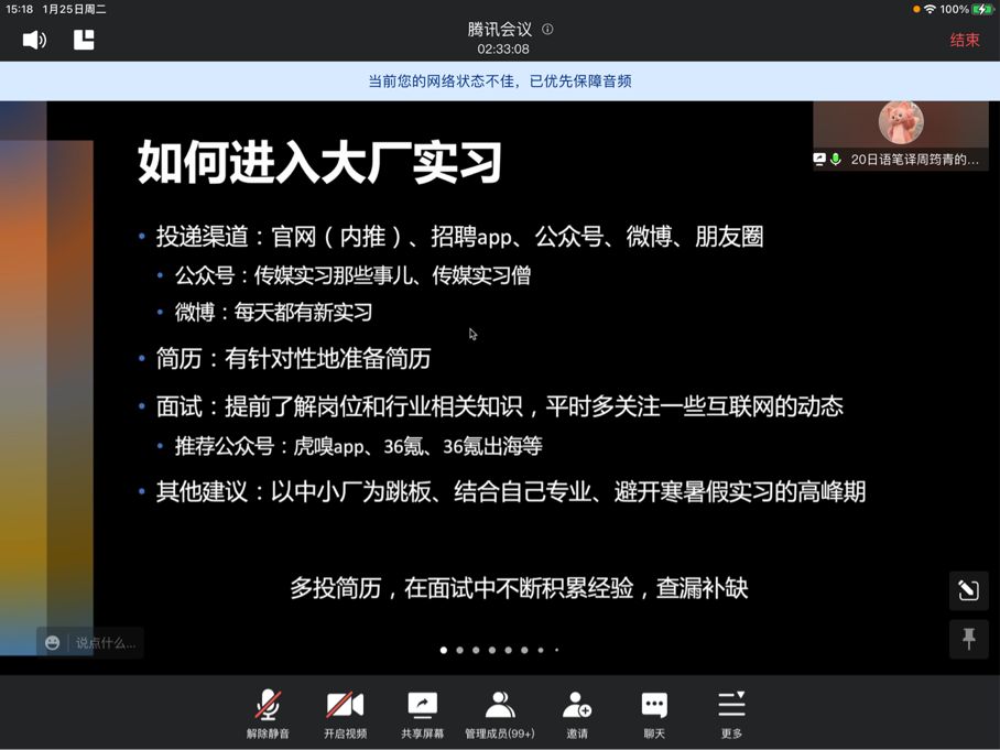 1月25日下午,金沙集团3354cc实践部举办了“职业生涯规划经验分享会——工作、实习、论文写作”。本次分享会采用线上方式,由21届英语语言文学专业刘越、王晶晶校友,在校生张雯、田鑫月、耿晓慧、周筠青、刘俊宇主讲。