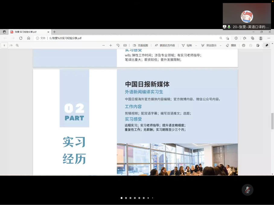 此外,耿晓慧、田鑫月进行了论文写作经验分享。就选题来源、论文的写作及修改、期刊选择、投稿等方面为大家提供了新思路。张雯、周筠青、刘俊宇进行了实习经验分享。张雯侧重MTI翻译实习经历,提出了“转变学生思维,注重实习质量及信息的时效性”三点实习方法。周筠青介绍互联网大厂实习经历,加强了大家对互联网行业的认识。刘俊宇介绍了教师编制面试礼仪要求,给出了参考与禁忌。