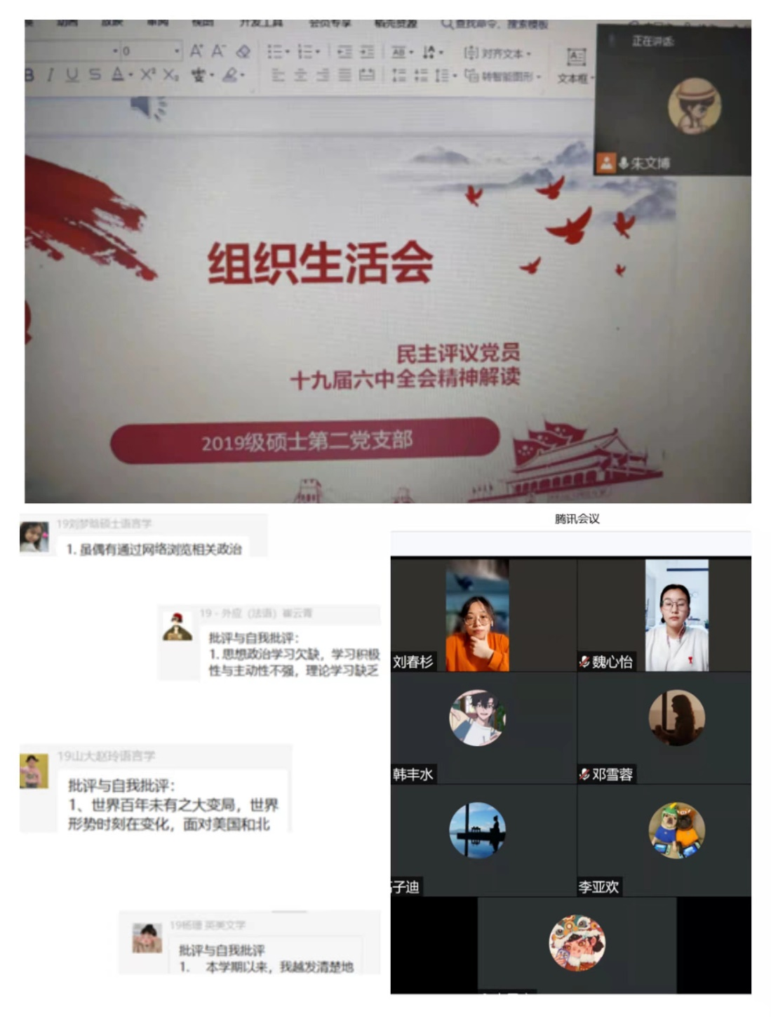 2020级硕士各党支部分别以线上和线下的形式开展了新学期第一次组织生活会。首先,各支部书记带领大家进行了专题学习研讨。会上,全体党员认真集中学习两会精神,熟悉政府工作报告。此后,全体党员认真深入地查摆问题。党支部委员之间、党支部委员和党员之间、党员和党员之间普遍开展了谈心谈话,指出了存在的问题。另外,支部全体党员认真严肃地开展了批评和自我批评。各党支部书记代表党支部委员会报告了党支部近来的工作,通报了党支部委员会查摆问题等方面情况。最后,各支部进行了民主评议,选举优秀党员。通过此次组织生活会和民主生活会,全体党员增加了对时政的关切,深入了解了两会精神,对自身有了更清晰的定位,并加强了个人责任感和使命感。