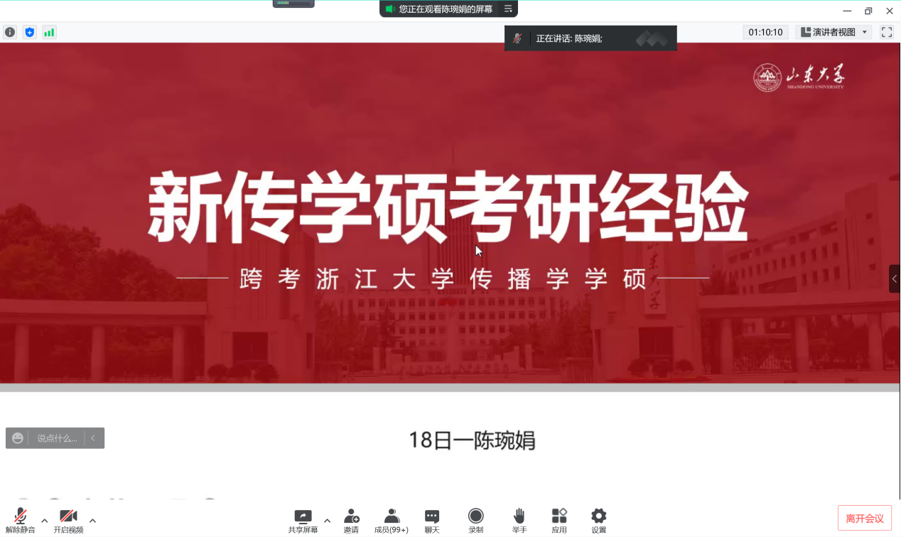 2018级日语专业本科生陈琬娟现已考研至浙江大学传媒与国际文化学院传播学专业。她简要概括了自己的时间安排。结合自身经历,她就专业课、政治、日语学科备考经验进行了细致的讲解。她提出,择校动机是考研时需要考量的关键因素,个人需要在城市选择、考研难度、就业去向、学校实力等方面进行综合考量,从而确定心仪院校。