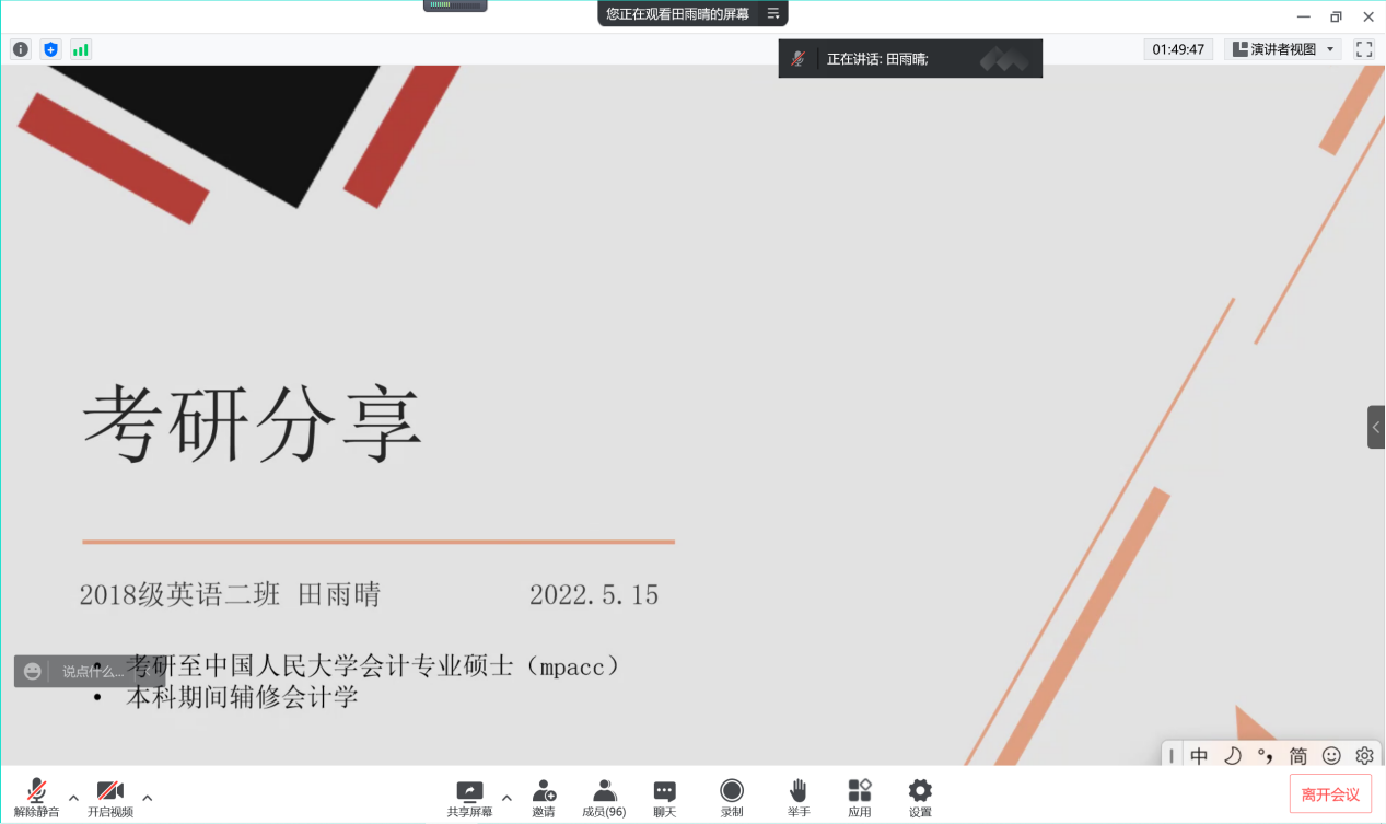 2018级英语专业本科生田雨晴现已考研至中国人民大学商学院会计专业。她就跨专业考研的优势和劣势进行详细说明,并对学校选择、备考过程、心态调整等方面提出了自己的见解。她明确指出,我们应该了解所选择专业的学习内容和研究方向,明确就业方向与个人的未来发展,在此基础上做出适合自己的考研选择。