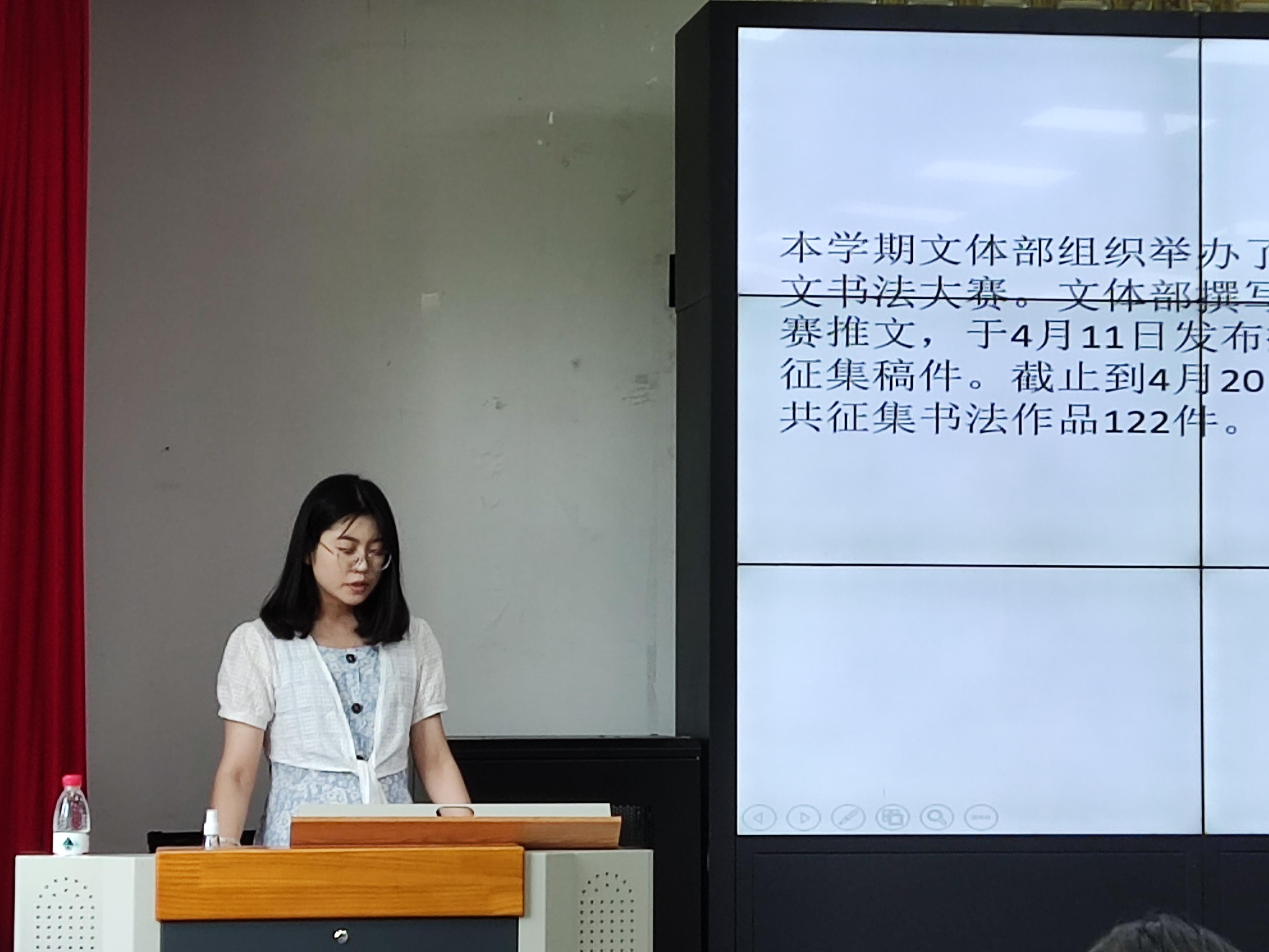 会议伊始,张新苑对研会工作进行总体提要,回顾并肯定了研会的工作成果,明确了6月份及暑假的工作安排,鼓励大家再接再厉,继续发扬研会的优良传统。随后研究生会各部门代表依次进行部门工作总结。主席团张倩雯汇报了寒假以来开展的各项活动及分工,包括配合开展防疫工作、研会中期交流团建、研究生会答辩、院级好导师推选活动、成立十三次研代会筹备委员会等,并总结了过往工作经验。秘书处本学期举办或协助展开了绿植领养、我心目中的好导师评选、文化交流微视频交流大赛等活动,陈冉冉从部门分工、部门经验反思、成员感悟三个方面展开工作汇报,总结了交接事宜、开发票、教室预约、活动签到及公示等工作当中的注意事项,对既往工作的反思总结、积累经验。齐冬梅概述了学术部本学期的主要工作,包括中国大学生英语辩论赛金沙集团3354cc校选赛、开题经验分享会、导学思政云下午茶系列活动、了解学术动态提供学术讲座信息等,并展示了学术部成员的工作感言,全面总结工作总结。宣传部王钰莹汇报了包括推文撰写、通知公告代发、投稿、公众号运营等部门基础工作开展情况,以及“榜样的力量”系列专访、洪楼时光留声机云歌会及洪楼春夏摄影大赛等活动的举办过程;并以此出发进行了工作中收获与反思的总结。实践部王新雨总结了部门各项日常工作,包括发布实习招聘信息、就业专题讲座等,并进行了工作反思和展望,提出实践部将在继承优良传统的基础上敢于创新,举办更多适应同学就业需求的活动,同时加大宣传力度、改变宣传方式。王宏艳对本学期文体部所举办的线上书法大赛、研究生运动嘉年华、羽毛球赛、洪楼春夏摄影比赛等各项活动进行了汇报,在过程中总结了成功经验并反思了不足之处。杨嘉瑄总结了本学期《语翼》编辑部的工作情况;部门在优化征稿策略、提高工作成效的同时,还主办了夏日多语种短诗比赛;在今后的工作中,《语翼》编辑部将注意翻译材料的选择、把握进度并适当举办活动。
