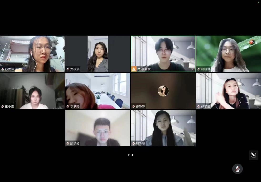 接下来,在社团负责人线上交流这一部分,各社团负责人分别阐述了自己对于上一学年社团工作的感想,指出了其中的一些问题与不足之处,并就如何解决这些问题以及对社团未来发展的规划做出了详细说明。尼诺剧社负责人强调,新学期要重点抓好演员培训工作,并在办好大型话剧活动的同时,举办一些短剧活动,在其中融入外院的语言特色。演讲协会负责人同样也提出了利用外院语言优势打造多语种演讲活动品牌的想法,同时,她还指出了演讲协会内部建设的不足,强调在新学期要抓好内部建设,提升社团内部凝聚力。语种协会负责人表示,语种协会的最大优势来自于七语文化,因此在新学年要利用好这一优势,开展相关国家文化的分享活动。心理协会负责人重点认识到社团活动参与人数不足的问题,指出要在新学年丰富活动举办形式,提升宣传力度,并就如何利用好心灵氧吧这一资源优势开展心协活动提出了初步设想。区域国别与全球治理研究协会联络人与青年思想理论协会负责人分别阐述了社团内部的工作体系以及活动举办的相关内容,条理清晰地明确了社团运行的整体架构。最后,社团工作部李嘉骏总结了上述负责人的发言,并分别给予了各社团在新学年工作开展与活动举办方面的建议。