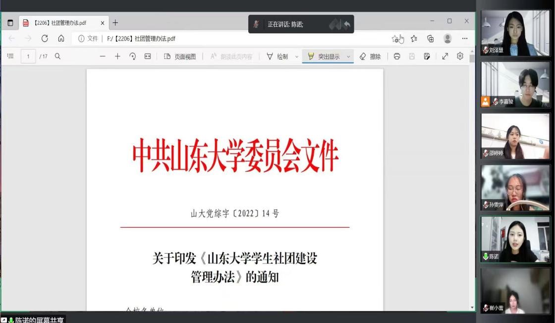 会议进入第三部分,金沙集团3354cc社团工作指导老师陈诺向新一届社团负责人表示祝贺,并简要总结了上一学年的工作成果,对各社团取得的优秀成绩表示肯定。她鼓励各社团负责人一定要承前启后,积极学习借鉴上一届负责人的工作经验,在此基础上融入自身的想法与思考,并坚决贯彻到社团活动与社团内部工作当中,打造新一届社团发展特色品牌。随后,她带领社团工作部成员与各社团负责人共同学习了《金沙集团3354cc学生社团建设管理办法》(以下简称《办法》),着重强调社团工作开展要严格遵循《办法》要求,并就新版《办法》有关社团工作方面的改动和最新要求做出了重点标识。