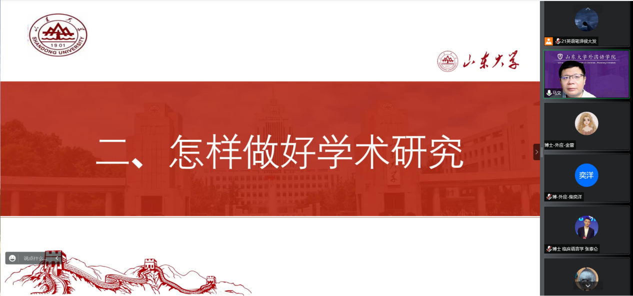讲座伊始,马文首先向同学们介绍了学校、学院的发展历史、学科水平以及学术团队情况,并结合同学们的学习生活,与同学们探讨了外语人才培养体系,外语学科的研究平台,以及外语学科的未来发展。针对怎样做好学术研究问题,马文建议同学们要专心治学,认真对待专业课程学习,积极参加各种学术报告,具备交叉学科的意识,广泛参与学术实践活动,培养研究兴趣,提高研究水平,肩负社会责任与担当,遵循“四个面向”。马文提出,从本科到研究生阶段,同学们需要根据身份的转换树立自己的目标,努力成为高级研究型人才和高级应用型人才。谈及研究生怎样培养科研能力,马文指出,要善于思考、总结、提炼,善于和导师、同学交流,善于提高技能等,希望同学们在科研生涯中保持自信自强、持之以恒、戒骄戒躁。随后,马文以案例分享的方式向同学们介绍了学术不端与学术规范,以及涉及学术不端的处理办法、政策及规定,并从五个方面介绍了学术规范的基本要求,系统地对学术规范政策进行了解读;并介绍了金沙官网的相关政策,重点阐述了学术论文的查重标准、引文规范、格式规范、论文署名等同学们经常遇到的学术规范问题,讲解了学术不端的责任问题以及后果处理,并表示:端正的学术态度决定一切,要具有严谨的治学精神。最后,马文希望同学们尽快进入学习状态,根据实际情况合理分配学习和生活时间,密切联系导师;鼓励学术学位的同学勤思考、多研究,专业学位的同学多参与专业实践活动;切实推进今后的学术研究,践行学术道德规范,并祝愿大家度过充实而富有成果的研究生学术生涯。