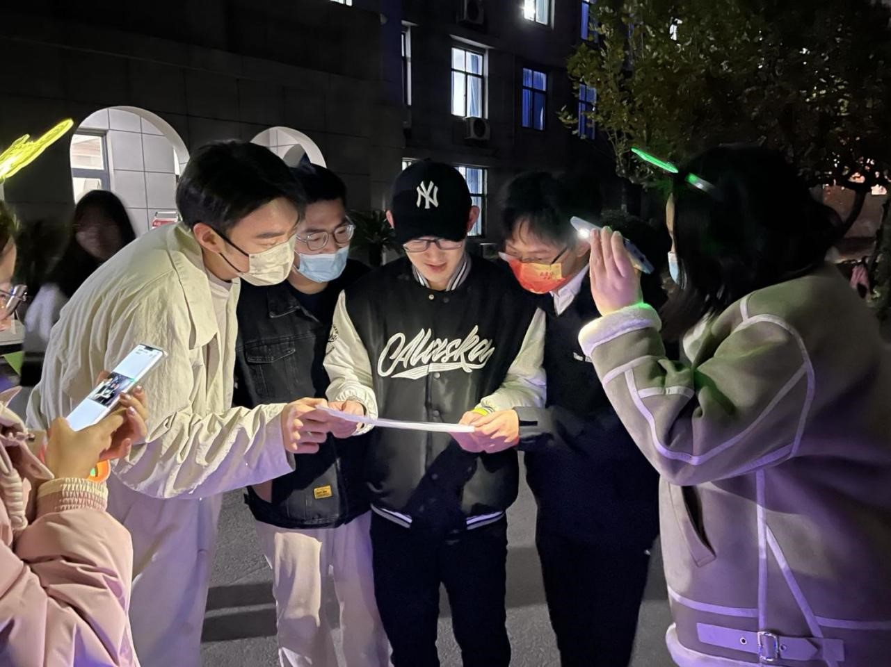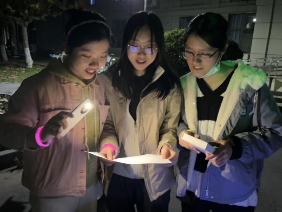 各队到达操场后,陆续开始完成最后一个关卡的打卡任务。在此环节中,各队队员分工合作、配合默契,克服了重重困难,顺利地完成了目标。通过散步和完成趣味活动,大家释放了一天的压力,每个人脸上都洋溢着笑容。