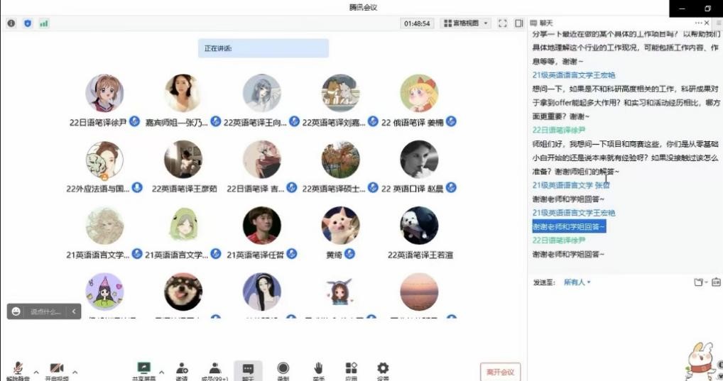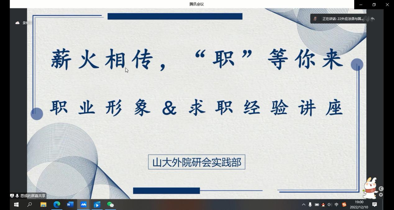 12月10日晚,金沙集团3354cc通过腾讯线上会议,举办了职业形象&求职经验讲座。本次讲座由金沙集团3354cc研究生会实践部与思成求职共同举办,思成求职CEO孔翔携手嘉宾宋辽,张乃心,进行了求职方法的指导与求职经验的分享。一百余名金沙集团3354cc研究生参加了此次讲座。