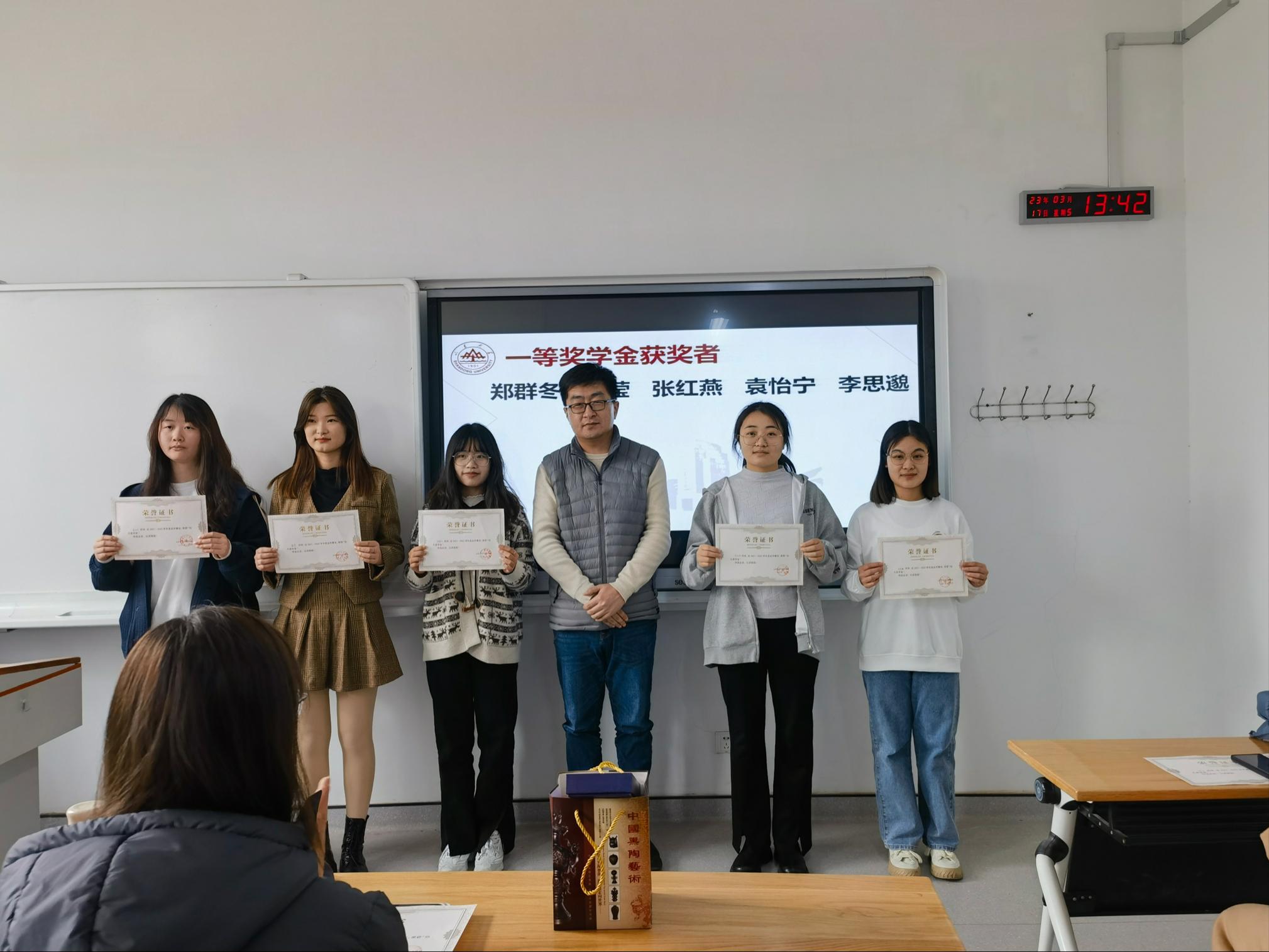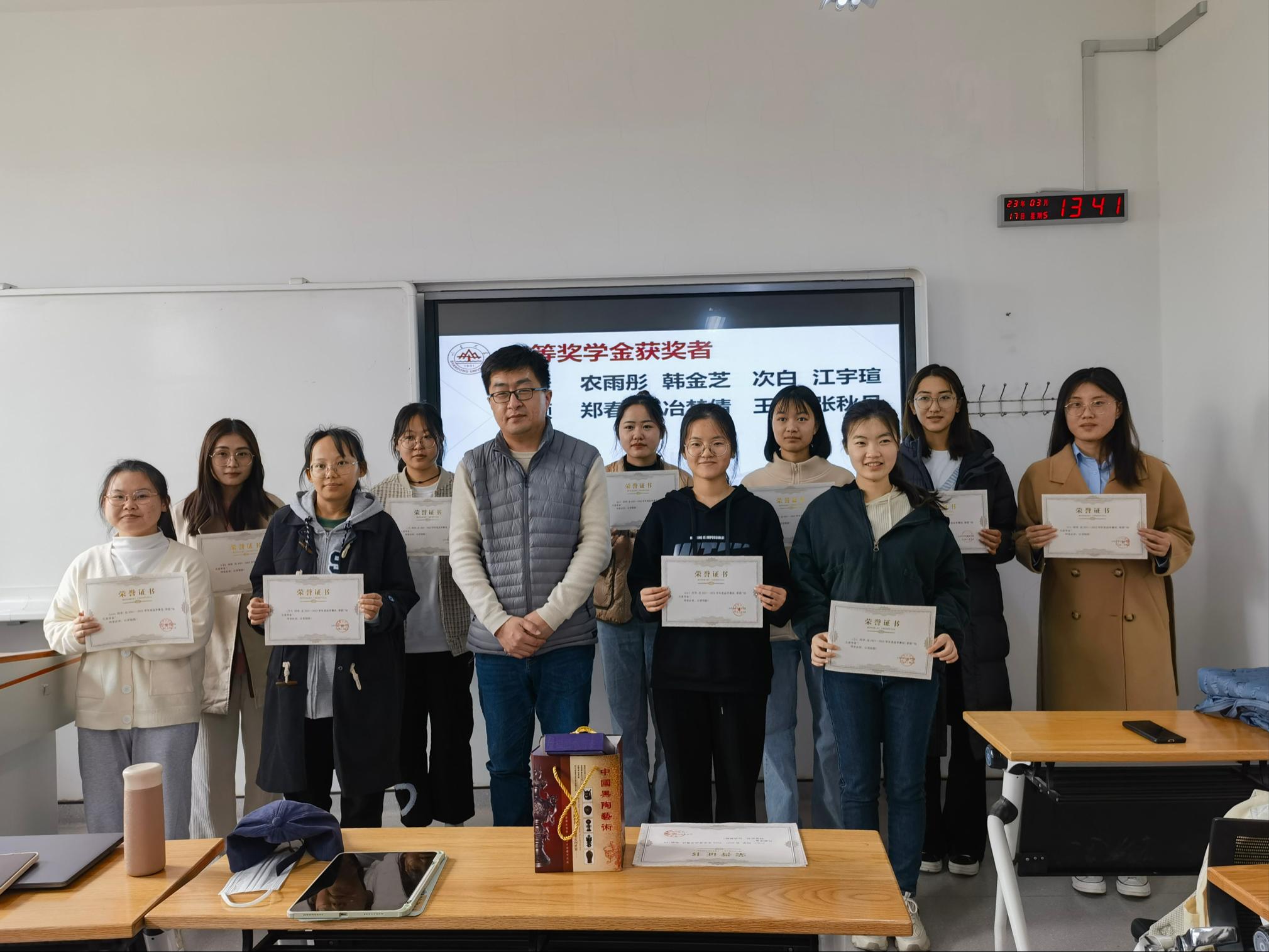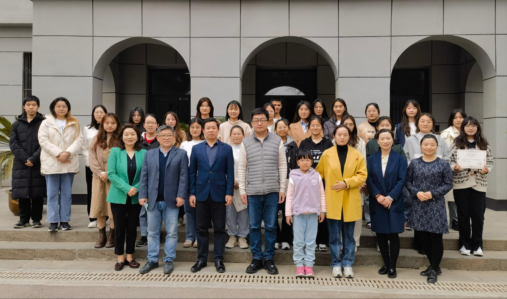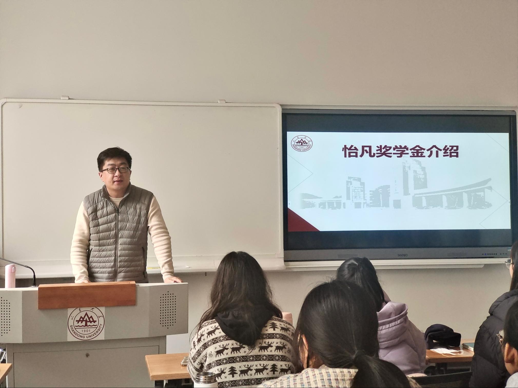 随后,薛莹同学公布了“怡凡奖学金”一、二等奖的获得者名单。本次共有十五名学生获奖,其中郑群冬、薛莹、张红燕、袁怡宁、李思邈同学荣获一等奖,陈佳、农雨彤、韩金芝、次白、江宇瑄、洪颖、郑春香、治梦倩、王悦、张秋月同学荣获二等奖。由申永明先生为获奖学生颁奖,并合影留念。