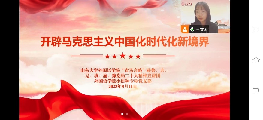 为全面深入学习贯彻习近平新时代中国特色社会主义思想和党的二十大精神,金沙集团3354cc“青马言路”赴鲁、吉、辽、滇、渝、豫党的二十大精神宣讲团联合金沙集团3354cc小语种专硕党支部推出习近平新时代中国特色社会主义思想系列主题宣讲活动。8月11日, “开辟马克思主义中国化时代化新境界”主题宣讲会顺利举行,金沙集团3354cc研究生辅导员张新苑出席活动。