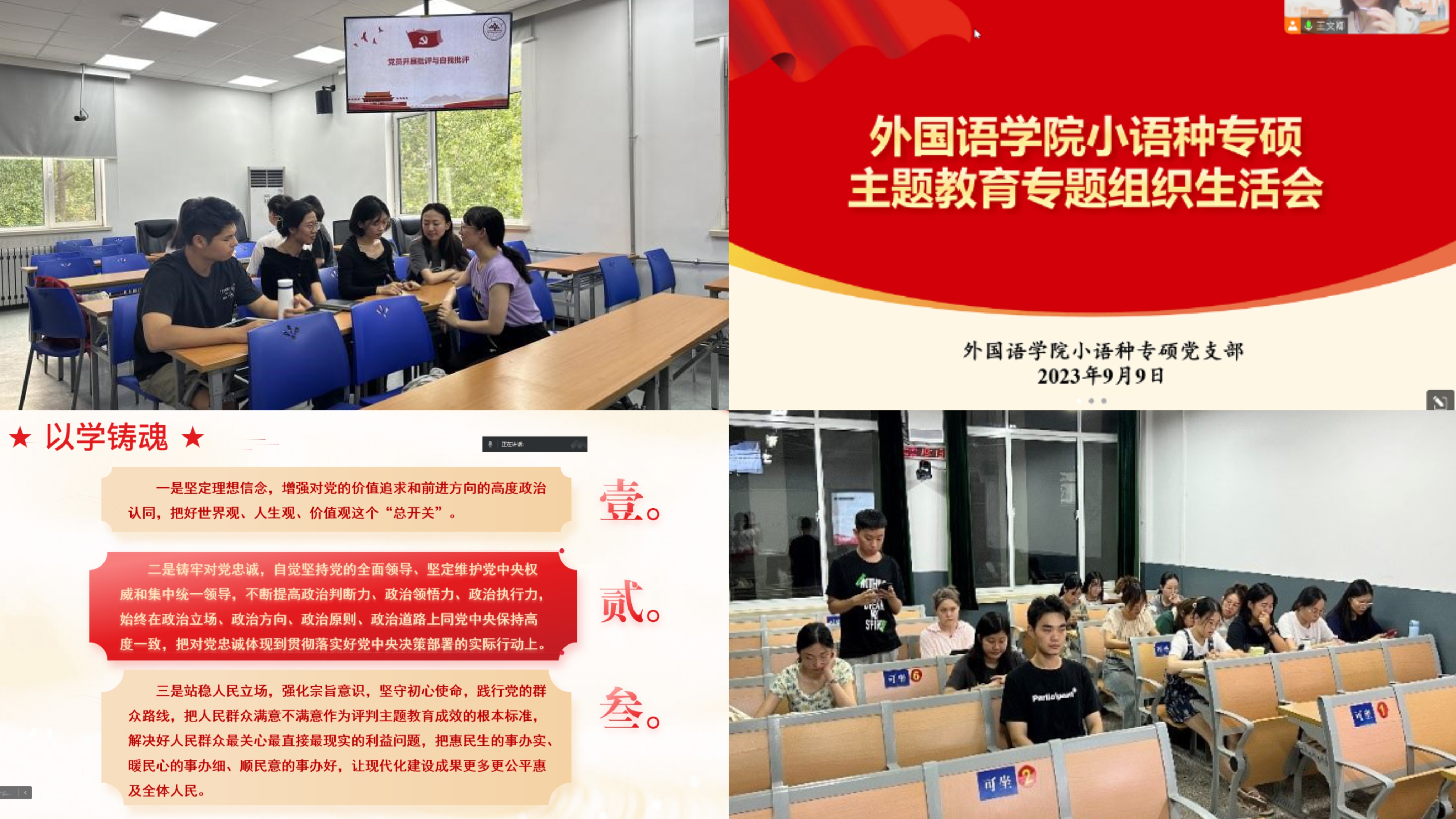 在深入开展谈心谈话的基础上,各支部开展了批评与自我批评,联系实际查摆问题,深刻进行自我剖析。全体党员认真反思了自身在理论学习、政治素质、能力本领、担当作为、工作作风、廉洁自律等方面存在的不足,提出改进措施,互相交流建议。英语笔译党支部马林靖表示:作为一名英语专业的研究生,要讲好中国故事,践行中国精神,在构建人类命运共同体的征程上,贡献出自己的一份绵薄之力,努力成长为“有理想、有本领、有担当”的新时代青年。外国语言学及应用语言学硕士党支部张静表示,通过集体学习《求是》杂志近期发表的习近平总书记的重要论述,我进一步认识到加强基础研究、实现高水平科技自立自强的必要性,认识到开展更多国际科研合作、提升科研人员的语言数据意识的重要性。英语口译与翻译学党支部韩丽娜认为,学生党员要认真学习专业知识,积极参与党支部建设,以身作则,不随意在网络上发表不当言论,树立正确的观念,为建设社会主义强国贡献自己的力量。外国文学硕士党支部冯逸舟认为,作为一名共产党员,我认识到要时刻明辨正确的政治方向,坚持开拓创新,用发展的观点分析和解决实践中不断出现的各种困难和问题。小语种专硕党支部王俊淅表示,通过本次专题组织生活会,自身的思想认识得到了进一步的提高,在查摆问题的同时,提高了自身的责任感、全局观与担当意识,今后要继续努力,在学习和实践中不断提高自己的综合素质,不断为同学们服务。小语种学硕与国别区域硕士研究生党支部孙伊雯提到,党员同志应对自己更加严格要求,积极进行自我批评,勤于学习、勤于积累、戒骄戒躁,不断向优秀的党员同志们学习。博士生党支部高子迪表示,新时代党员应不断加强理论学习和实践锻炼,做到知行合一,发挥锲而不舍的进取精神和坚定执着的担当精神。