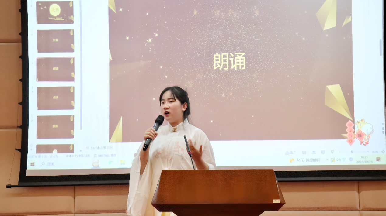 吴迪同学带来的英文朗诵《爸爸的诗》表达了一名父亲对儿子温厚的爱,而吴迪同学则将诗中蕴含的情感淋漓尽致的展现出来,牵动着每一位在场观众的心弦。陈曼妮同学的英文朗诵《Youth》则充分表达了青春的魅力,强调青年理应心怀家国、砥砺前行,其自然大方的台风也获得了评委们的一致好评。此外,选手们不但在朗诵内容上精雕细琢,也在服装与表演形式上推陈出新,令人眼前一亮。唐雅晨同学身着一身汉服,娓娓道来爱国诗人屈原的名作《离骚》的英译选段,不仅展现了中华传统诗赋之美,也弘扬了以爱国主义为核心的中华民族精神,亦诠释了不同语言之间的融合创新。