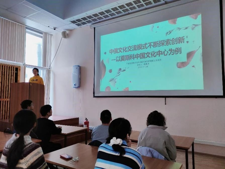 陈春晓以“中俄文化交流模式不断探索创新——以莫斯科中国文化中心为例”为题展开线下宣讲。首先介绍了莫斯科中国文化中心的创办历史、地理位置、工作宗旨等基本信息,让在场的中外学生对这一官方文化机构有所了解,而后以图文并茂的方式列举该中心举办过的展览、讲座、电影放映等文化活动,最后介绍莫斯科文化中心最新举办的“今日中国”回顾与展望暨“阅读中国”节目开播仪式,关注中俄文化交流新动态和新模式。