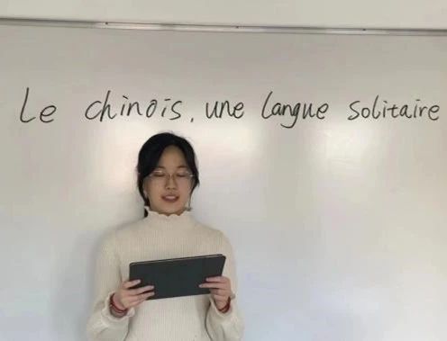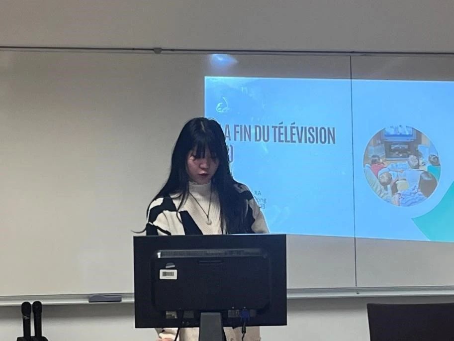 贾秋莎以“城市之光:探索中国代表城市与市民娱乐生活”为题展开线下宣讲。她从大众娱乐角度入手,以电视这一重要的广播和视频通信工具为例,为大家介绍电视的起源与发展、节目种类、电视在现代生活中的重要性等,同时尝试用法语解释中国著名电视剧、电影以及娱乐节目的图片和影像片段。而后通过放映短视频,向法国学生展示北京、上海、广州等城市的人文风光和居民生活方式,向外国友人展现一个更加立体和真实的中国形象。