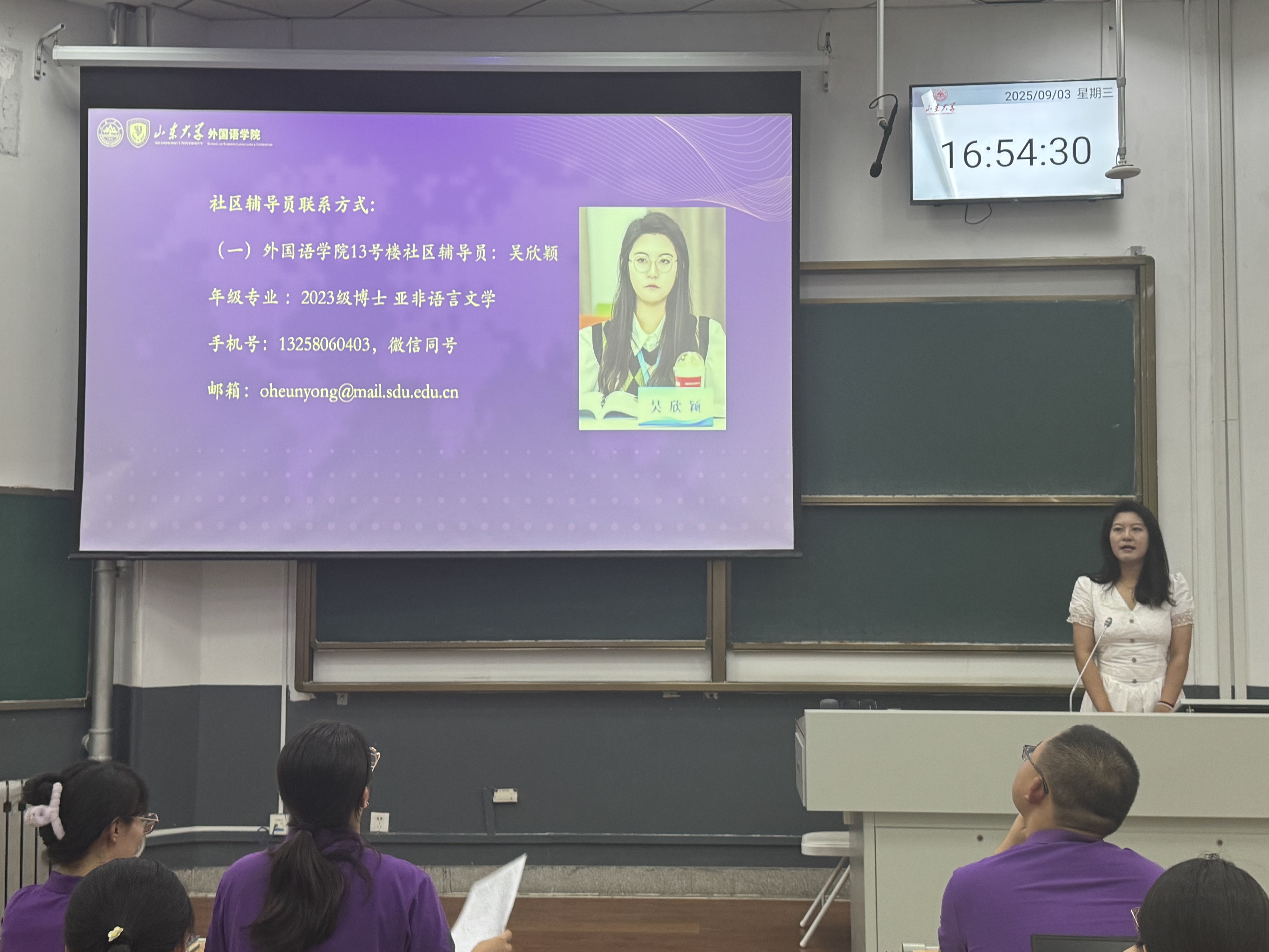 刘静姝简要介绍了研究生管理科的核心职责,重点强调了招生、培养、毕业各环节的关键事项,并提醒同学们近期需及时完成培养计划的制定与选课等事宜;