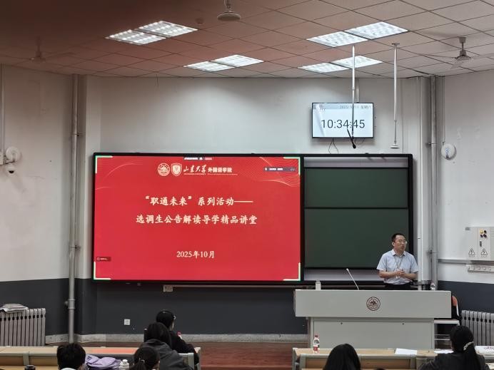 本次讲堂不仅为同学们提供了一个全面了解公职类考试的机会,还帮助同学们在了解考情、明确方向和选择岗位方面获得了清晰的认识,为同学们的职业规划和未来发展打下坚实的基础。本次讲座为山大外院就业指导系列活动之一,为全面响应并深度契合外院学子们对于就业指导的多元化与深层次需求,山大外院特举办“职通未来”系列活动,包含公职类考试公告解读导学精品讲堂、国际组织实习专场交流分享会、申博经验分享会、多语教师技能大赛、“青衿报国”政务见习、星海“企”航企业见习等。本系列通过多元形式搭建校园与职场的衔接纽带,助力广大学子在求学过程中明确职业方向,精进专业能力,提升综合素养,引导外院学子肩负时代赋予的新使命,在新征程上昂扬奋进、勇敢前行。