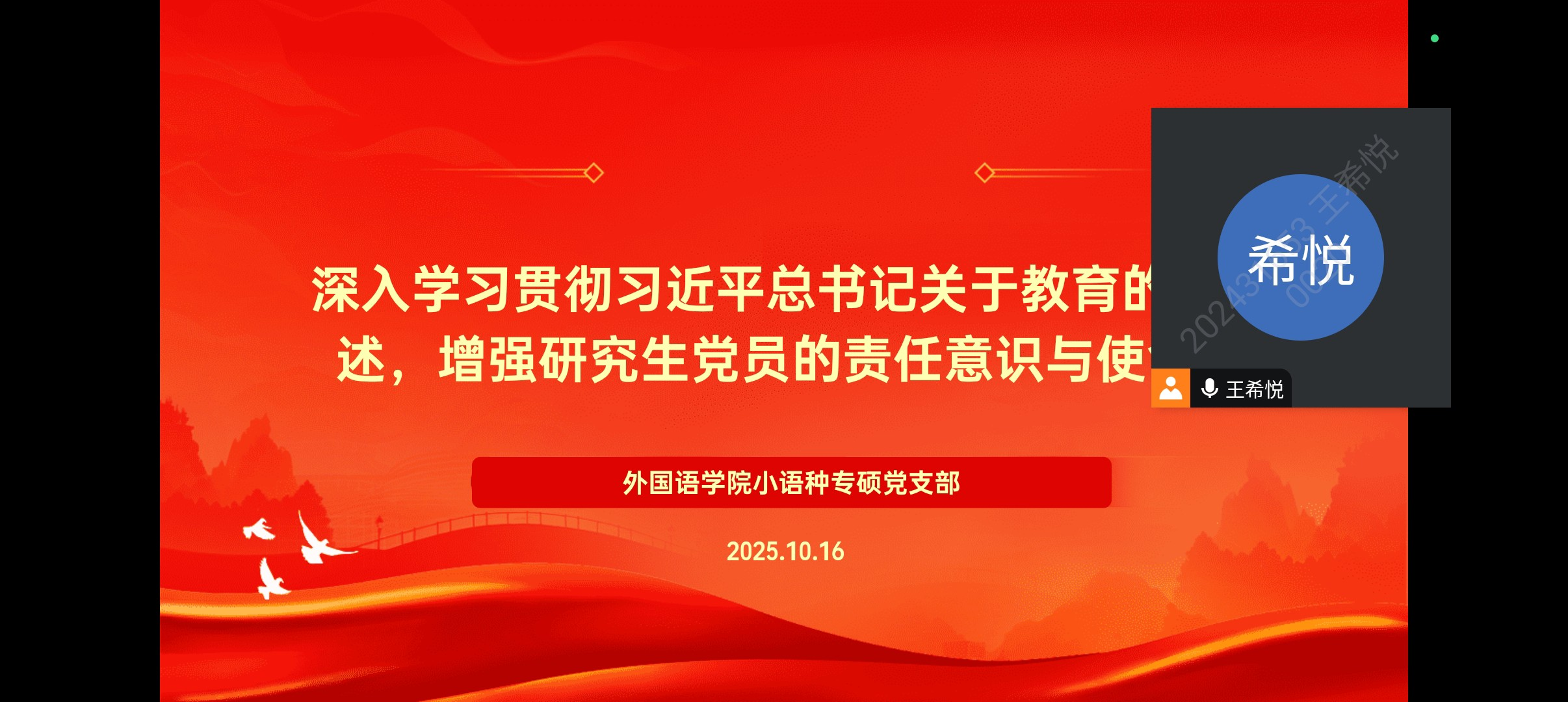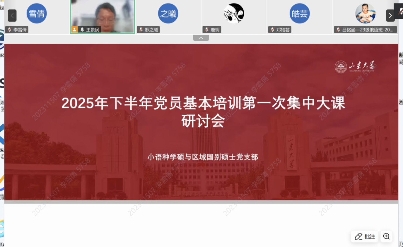 小语种学硕与国别区域硕士党支部召开线上研讨会。支部组织委员王景民同志首先回顾了怀进鹏部长的授课内容。表示,作为高校建设的参与者,自身使命光荣、责任重大。支部成员随后积极发言。吕子轩同志表示,通过党课学习,他真切感受到我国教育事业取得的辉煌成就,也意识到教育强国建设的重要意义。韩晓梦同志认为,研究生党员应筑牢信仰根基,将个人学术理想融入国家发展蓝图。