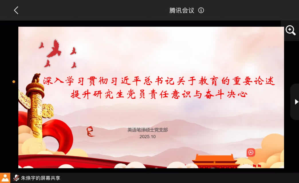 英语笔译硕士党支部召开线上专题交流研讨会,支部党员集中学习了习近平总书记在全国教育大会上的重要讲话精神等内容,并观看了怀进鹏部长的主讲视频。会议指出,习近平总书记关于教育的重要论述为建设中国特色社会主义教育强国提供了根本遵循和行动指南,支部将继续深化党员思想政治教育,深入贯彻相关会议精神。