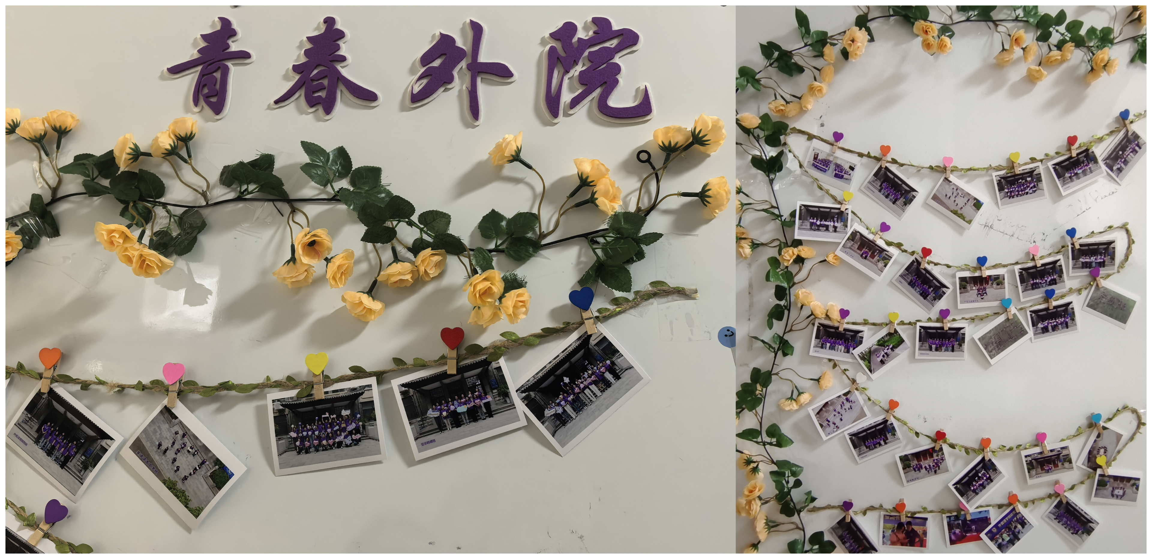本次主题展板以明快的暖色调为基础,巧妙运用花藤缠绕与手绘青春人物简笔画等元素,营造出活力盎然的视觉体验。展板核心内容注重“回望初心,续写期待”,以“照片回忆链”的形式,集中展示了开学报到时的鲜活特写与各班级创意十足的航拍合影,生动串联起2025级研究生新生从初入校园的懵懂好奇,到逐步融入外院学习与生活的成长轨迹。照片串成的回忆链里,有探索校园的好奇身影,有与新同学并肩微笑的青涩模样,也有班级合影里整齐举起的鲜花手牌,每一张画面都凝聚着初遇时的热忱与期盼,见证着成长中的蜕变与绽放,成为外院学子共同的青春印记。
