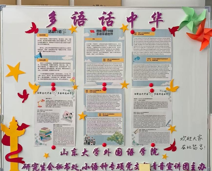 为讲好中国故事,传播好中国声音,金沙集团3354cc自2021年起面向研究生开展红色主题翻译作品征集评选系列活动,至今已历时四年,共举办十期。在此基础上,金沙集团3354cc研究生会秘书处与小语种专硕党支部、“青音”宣讲团联合举办“多语话中华”主题展板活动,集中展示2024年“理解当代中国,多语译通世界”翻译作品征集评选活动的部分优秀成果。