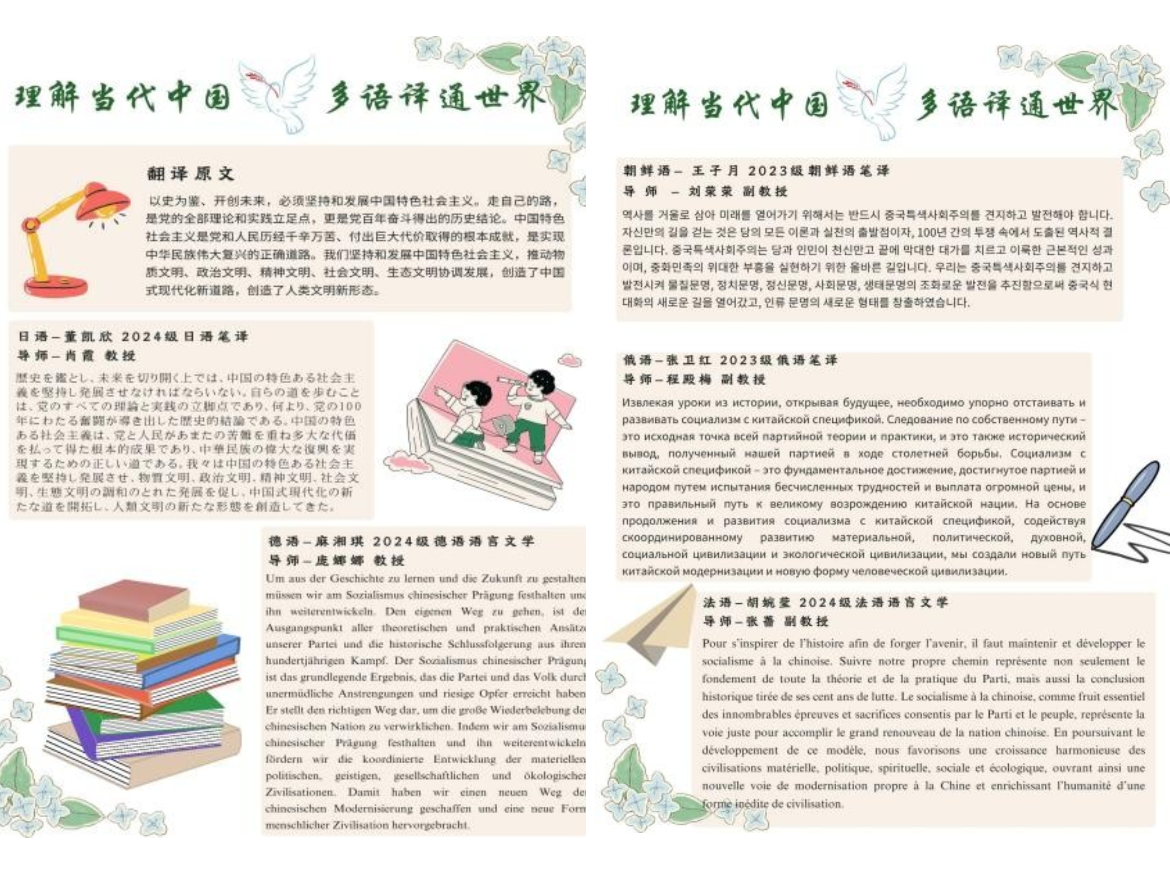 本次活动展出了刘奎、邢若飞、李雨纯、王昊天、蔡小凤、董凯欣、麻湘琪、王子月、张卫红、胡婉莹十位同学的翻译作品。同学们以多语种译笔搭建文明对话桥梁,让不同语言的文字传递相通的价值内涵,展现了新时代青年的语言素养与家国情怀。