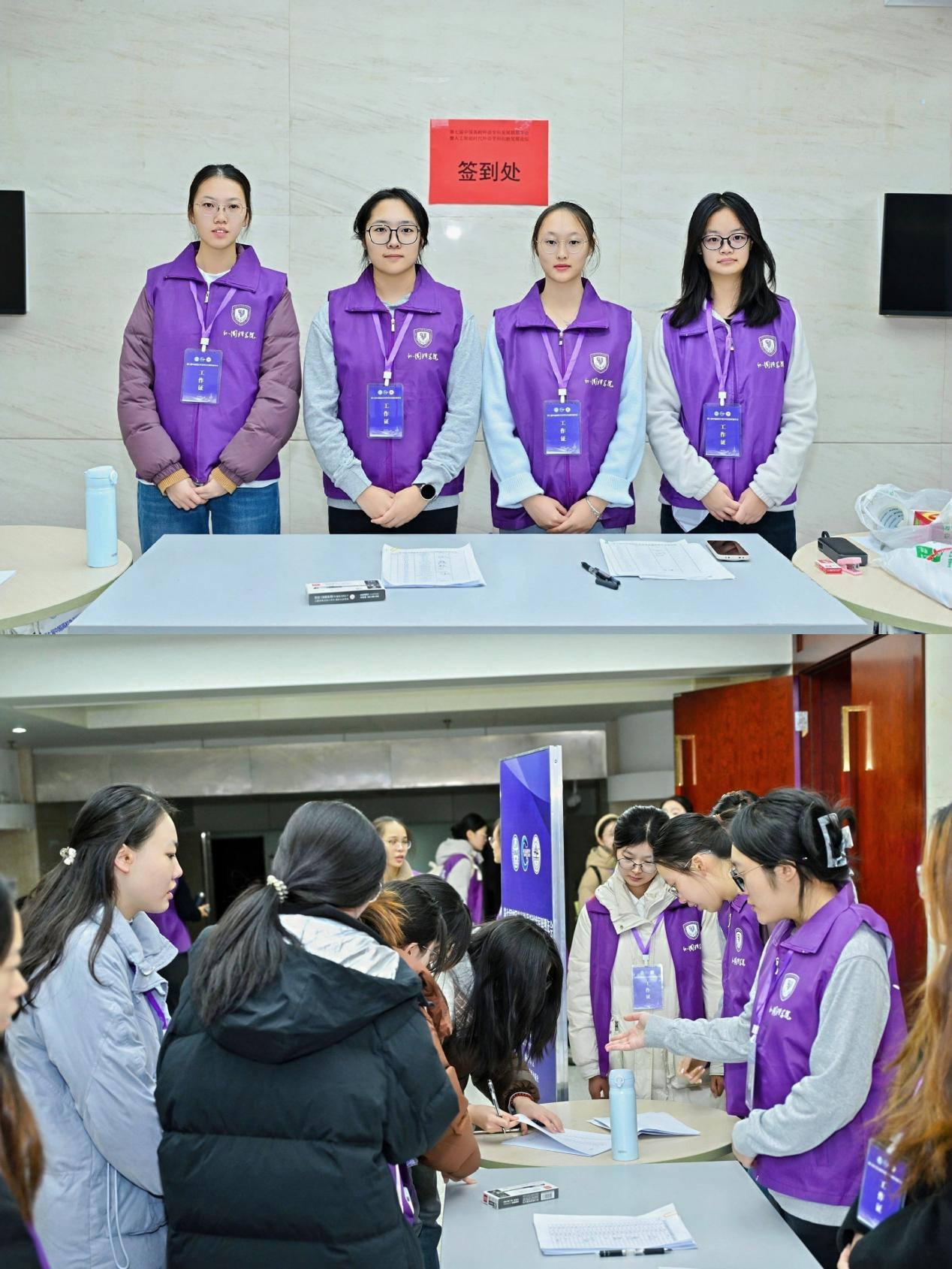 会议期间,志愿者们根据岗位需要分为多个小组,职责清晰,行动统一,形成了有序高效的工作合力。专家组为与会嘉宾提供一对一精准服务,包括接送站与陪同引导等任务,以细致周到的安排确保专家参会全程的顺畅。场外工作组在报到处与引导点进行签到接待、物料发放与路线指引,场内工作组在各会场承担场地布置、设备调试、会议记录、茶歇服务等多项工作,展现出高度的责任心与出色的执行力。新闻宣传组则负责全程摄影记录与新闻采编,及时传递会议的精彩瞬间,尽显志愿者们的青春风采。
