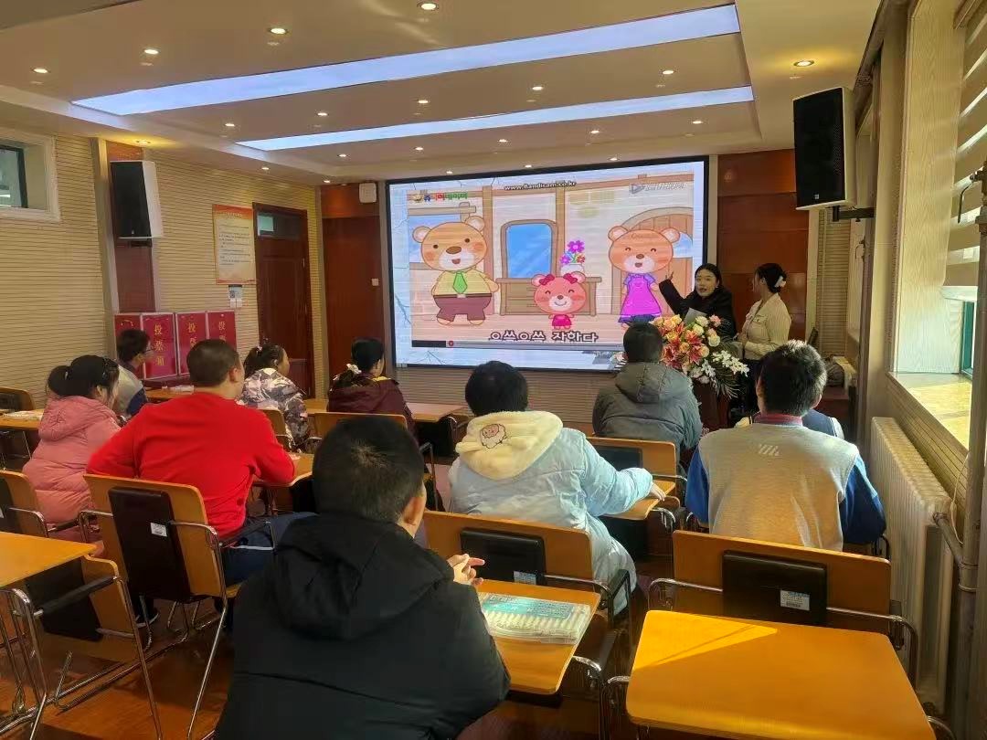 “서울 타워!경복궁!”朝鲜语专业的志愿者指着首尔塔、景福宫的精美图片,带孩子们认识韩国知名景点。大家跟着一遍遍认读韩语“你好(안녕하세요)”“谢谢(감사합니다)”“我爱你(사랑해요)”,从生疏跟读到熟练表达。在趣味讲解与互动问答中,孩子们既解锁了实用韩语,也悄悄打开了认识韩国的小窗口。