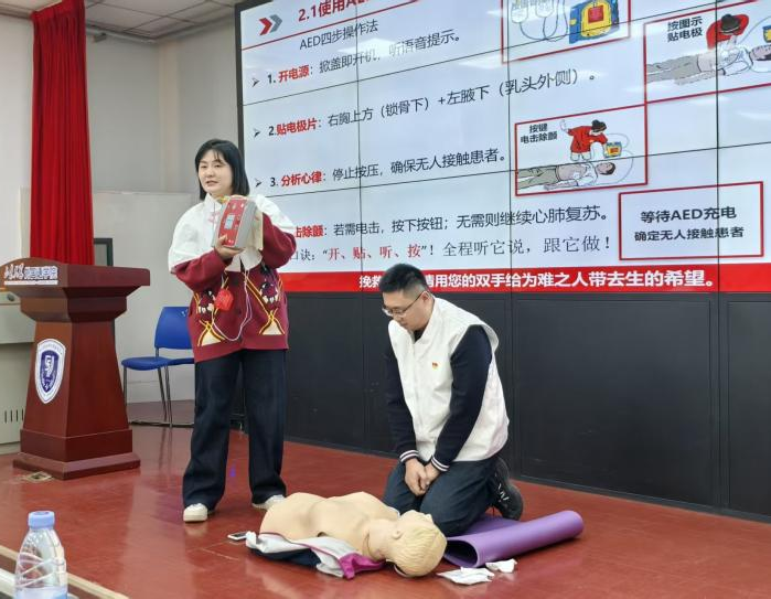 在操作演示环节,房馨和赵博文两位老师现场示范了成人心肺复苏(CPR)的标准步骤及AED的规范使用流程。从按压位置、频率到操作细节,每一个动作都严谨规范、条理清晰,为在场师生呈现了一堂“看得懂、学得会、用得上”的生动实践课。