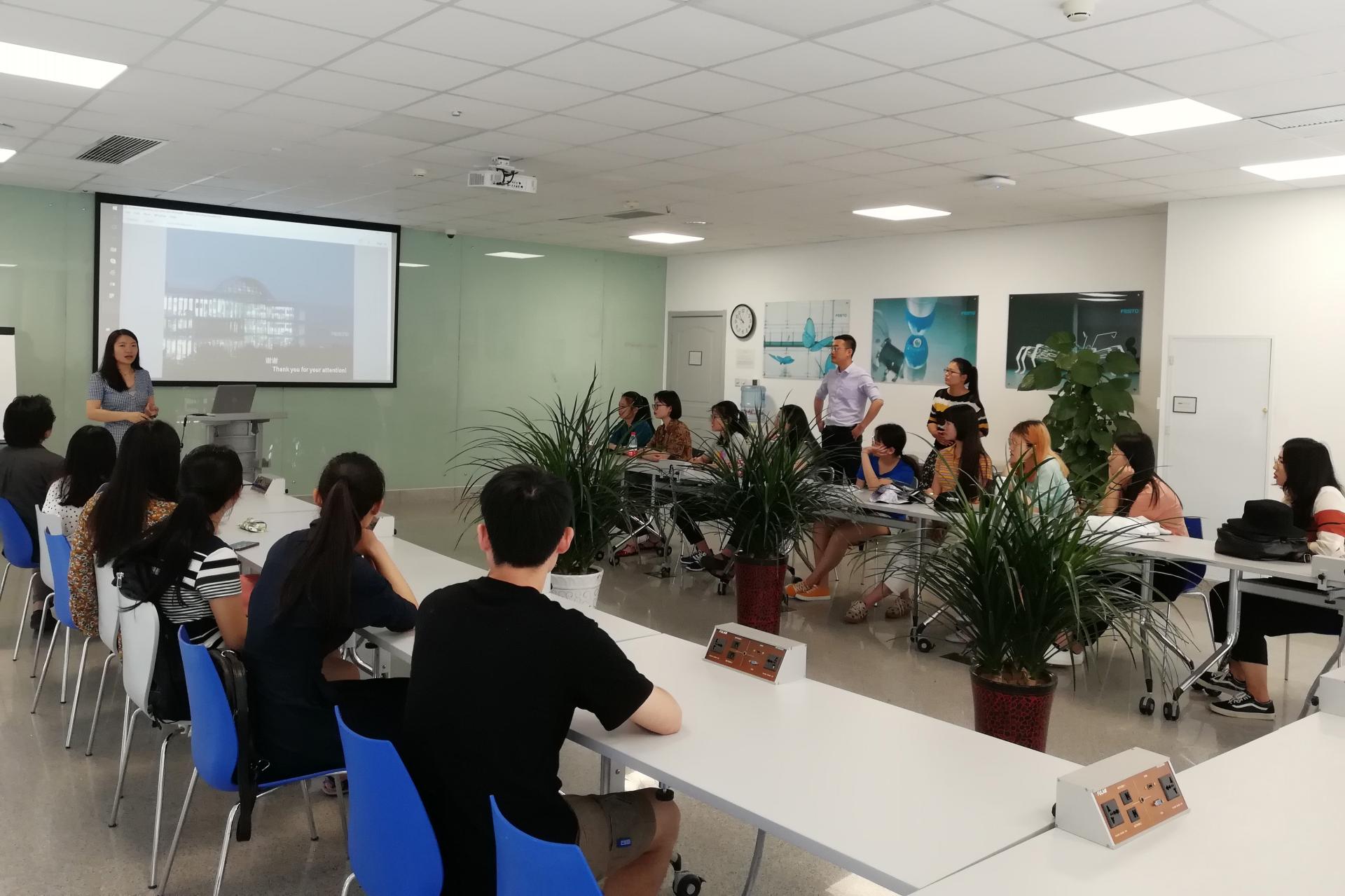 此次参观学习主要分为公司介绍与互动交流两个环节。费斯托济南分公司的三位工作人员首先从品牌历史,生产线流程,产品配送模式,人才培养模式以及企业文化等方面向同学们介绍了公司的基本情况,同学们了解到,作为自动化技术领域的领先者,费斯托公司不仅致力于提高产品质量与精准度,同时也是一家充满“人情味”的企业。