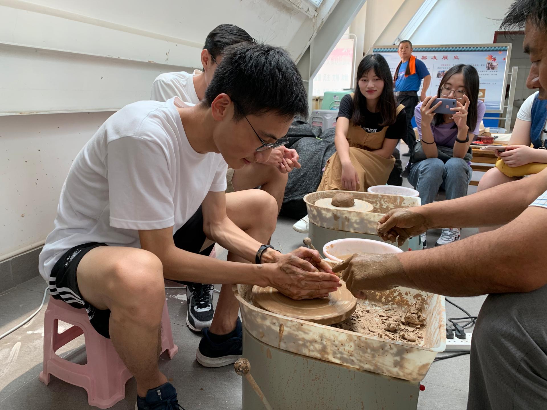 下午,调研队成员在博物馆中制陶师傅刘德江的带领下,体验手工拉胚制陶。刘德江先为队员们进行了演示,他通过巧妙地按压、揉捏,在电动拉胚机上将一块陶泥制成了一个圆罐。接着,队员们纷纷上手操作。队员们尝试着模仿刘德江的手法,定型、拉高、塑形。但看起来容易,做起来难。在刘德江的耐心指导下,队员们慢慢找到感觉,制作出了各式各样的陶器。在这期间,刘德江还为队员们讲解了许多关于黑陶文化和龙山历史的知识,队员们收获颇丰,受益匪浅。