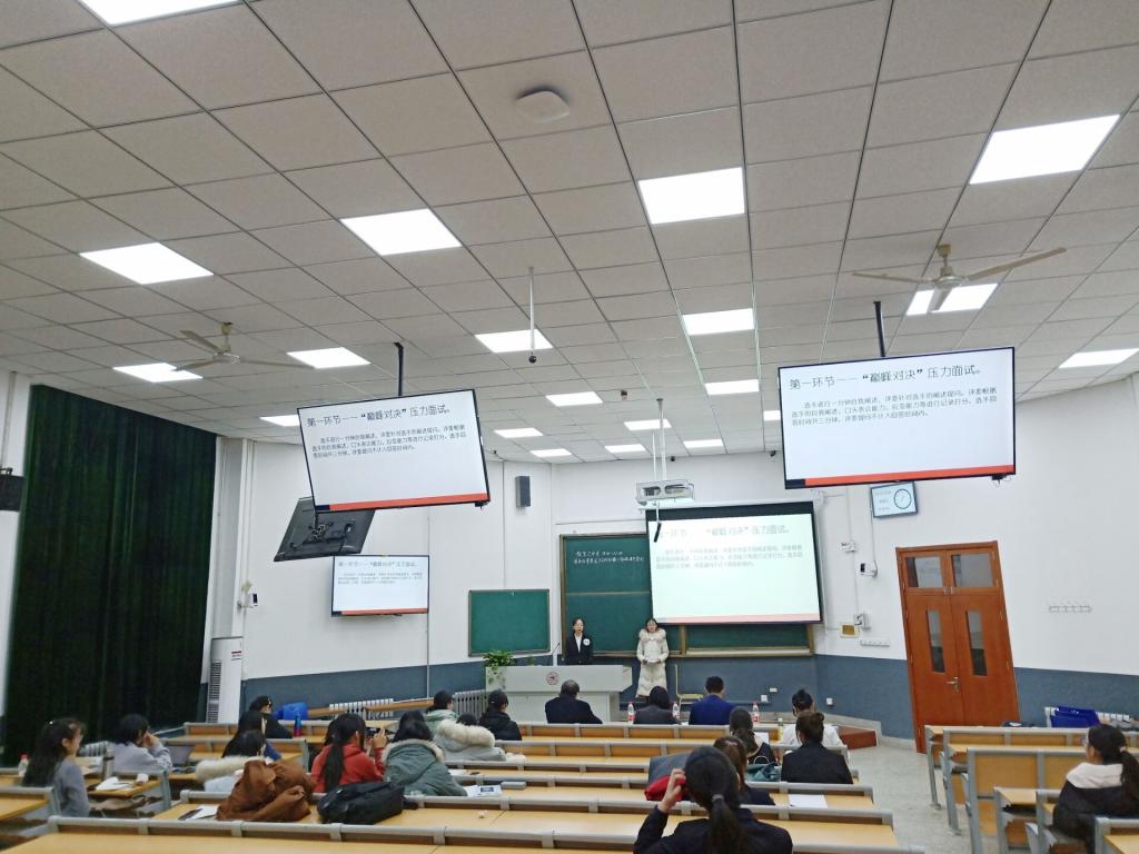 经过初赛的层层选拔,共有12位参赛选手晋级决赛。决赛共分为三个环节。第一环节“巅峰对决”压力面试,选手进行一分钟的自我阐述,并接受评委老师的提问。第二环节“群策群力”无领导小组讨论,选手分成不同的小组,面对特定的情景,进行紧张而有序的讨论。之后,评委老师针对选手表现逐一进行点评。在两个环节角逐后,共有6名选手晋级到第三环节。第三环节“化险为夷”危机公关,晋级选手根据情景充分准备后,得出自己的解决方案,代表公司解决所面临的危机。在比赛完成之后,评委老师就职场面试提问类型,危机公关五S原则进行了讲解。最后,由评委老师为获奖选手颁发奖状。