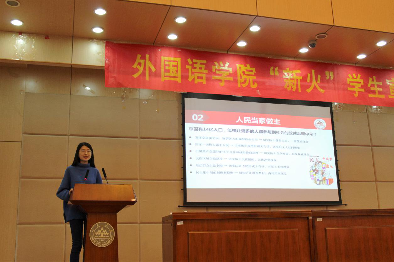 本次宣讲中,“新火”宣讲团成员丁嘉琪、张俊晴、马文啸与林佳慧、孙焕然、金也琪组成两支队伍,先后为2019级全体学生,2018级全体学生,2016级、2017级全体党员、预备党员、班委阐释了中国共产党的自身建设、人民当家作主的内涵、构建命运与共的美好世界这三个主题。