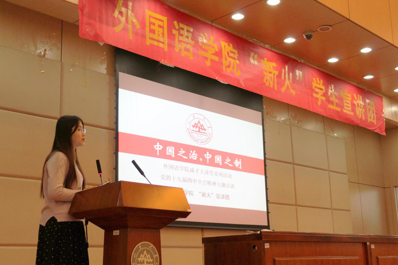 本次宣讲有效增进外院学生对于当代中国党和政府制度设计与治理模式的了解,促进学生深入学习宣传贯彻落实党的十九届四中全会精神,提高学生政治站位,全面提升大学生的政治素养与家国情怀,培养具有“大格局、大视野、大胸襟、大情怀”的中国特色社会主义青年力量。