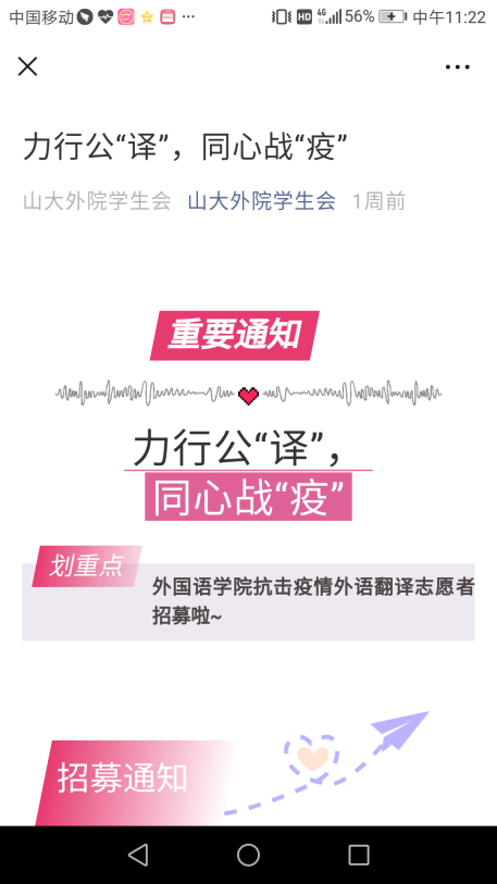 平台的创建,集聚了抗疫力量,为抗疫翻译工作的顺利进行提供了保障,有利于合理分配抗疫专业资源,推动抗疫工作顺利开展,表现出山大学子积极抗击疫情的信念情怀,体现了山大学子的责任担当,发挥了专业特长,贡献了青年力量。