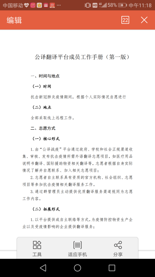 平台工作流程规范,规划合理有效。平台工作主要分为核心形式、拓展形式、创新形式三部分,以满足多样化的社会需求。核心形式的工作是平台工作的重心,由平台通过政府、学校以及社会正规渠道收集、审核并发布包括医疗用品翻译、国际援助物资翻译、基层涉外防疫工作翻译等志愿项目,组织志愿者积极参加;拓展形式与创新形式则是平台工作的辅助,工作内容包括为防护用品企业提供翻译服务、提供国内疫情最新进展报道翻译和辟谣等,其目的在于借助平台成员丰富的翻译工作经验,弥补平台方构想方面的不足,群策群力来为抗击疫情贡献力量。平台管理人员收集并筛选来自权威方发布的翻译援助需求,经过平台翻译研究中心专业人员的审核以及评估后,由人事部门的负责人员发布至平台,供平台成员自行认领。在平台成员翻译工作结束后,再由人事部门工作人员进行统一的收集,经翻译研究中心审核通过后,发送给相关需求方。