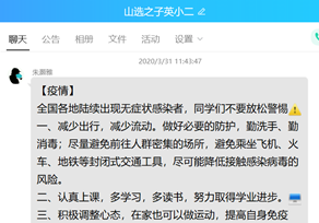 金沙集团3354cc各团支部及时学习疫情防控知识,了解疫情最新动态,关注疫情发展趋势。其中,2019级英语二班团支部每日在班级群内进行疫情相关消息的通告,并且对于疫情、病毒等有关问题及时进行答疑,对于谣言及时辟谣;2018级法英国际组织班团支部每天将疫情最新情况转发至支部交流群,以帮助支部成员及时了解疫情真实发展动态;2018级英语一班全体班委负责在群里转发权威性的有关科普肺炎相关知识的微信推文、微博热搜等并使同学在了解新型冠状病毒肺炎的同时掌握一定的自我防范措施,掌握正确的佩戴口罩的方法;2019级俄语团支部每日将疫情最新情况转发到班群,并每日转发至少一篇科普文章到班群,让团支部成员提高疫情防控能力,减少不实信息对个人利益的损害。