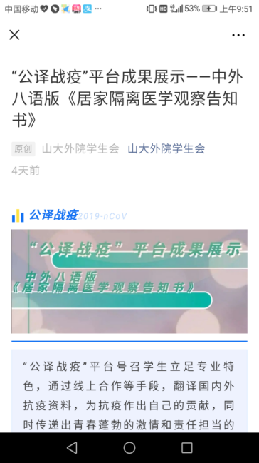 “公译战疫”平台借助以高校为主的外语人才资源,在疫情期间同心协力、尽己所能,为国家抗击疫情贡献力量。该平台充分展现了青年人的爱国精神与责任担当,为防疫一线贡献青年力量,向社会展现了山大学子的青春风采。