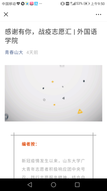 截至5月24日,“公译战疫”平台相关新闻报道27篇,包括报刊报道2篇,网站报道8篇,微信公众号报道17篇,另外登上《金沙集团3354cc新型冠状病毒肺炎疫情防控工作情况专报》(第38期),被树立为全校疫情防控工作突出典型。平台获推荐参评学校及全省示范志愿项目、获选为山大2个大学生抗疫志愿服务典型之一上报教育部高等教育司、获推荐参加联合国全球高级别志愿服务技术会议,同时获得报刊《齐鲁壹点》、《金沙集团3354cc校报》的报道。金沙集团3354cc官方网站、山大外院官网、金沙集团3354cc微信公众号等校内媒体多次报道宣传“公译战疫”平台的事迹,大力弘扬同心战“疫”、敢为当先的志愿精神。