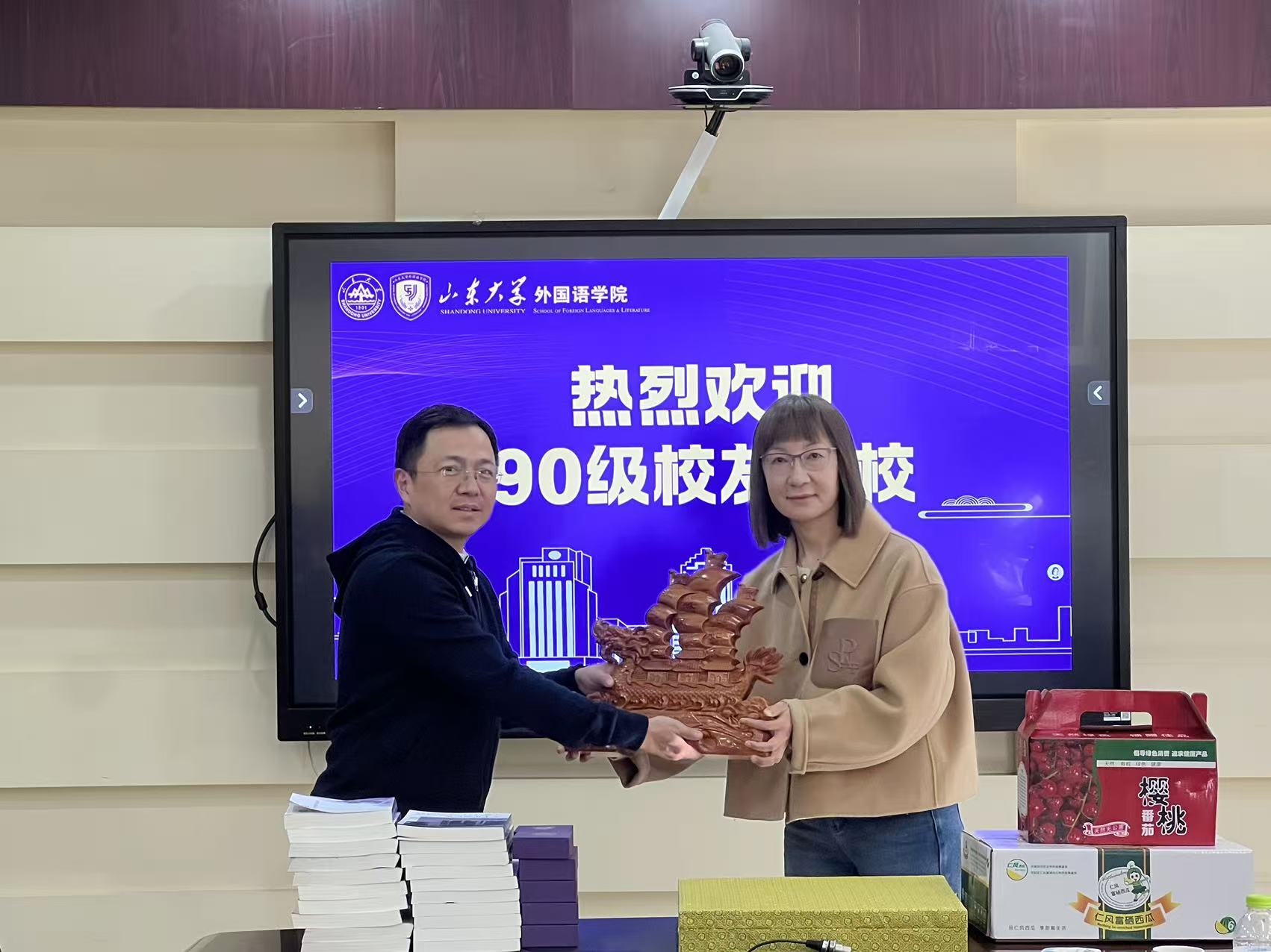 随后,学院与校友互赠纪念品。董老师代表学院向校友赠送了学院定制文创徽章与院史书籍;校友们也向学院回赠了木雕工艺品与地方特产,表达对母校的感恩之情。
